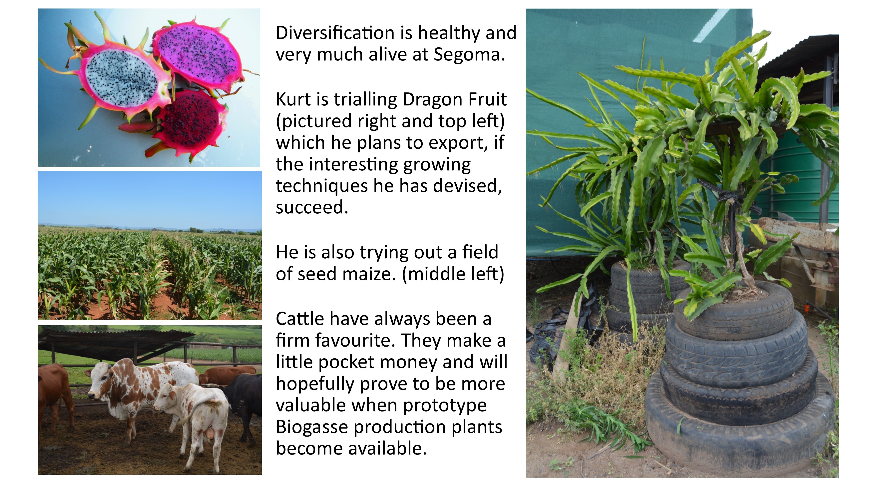 | Other income streams | Veggies, cattle, Irricheck, Dragon Fruit, Maize seed, game farm |