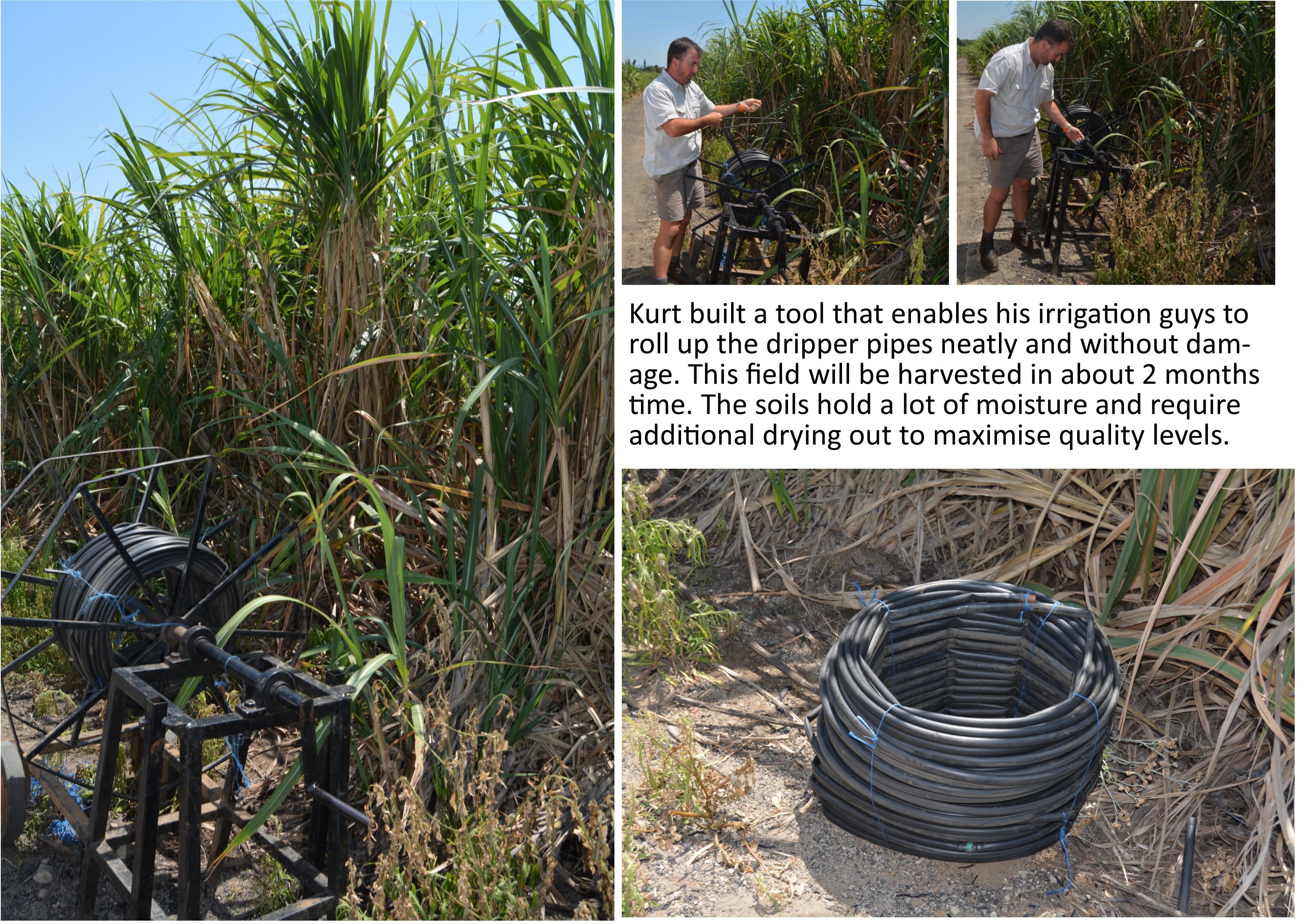 There are, of course, inhibitors to drip: not every farmer is a drip farmer as it requires lots of attention and care, in filtration and flushing particularly. Without adequate maintenance it can bankrupt you. Changing to a drip system can be expensive, depending on whether you chose subsurface or not. Kurt currently uses surface drippers because he needed to make a quick change. Subsurface requires new equipment and a different loading method and management of infield traffic. Pulling out the driplines every year can be a chore but there is always extra labour at some stage during the 8-10 week lead up to harvest during which the lines can be pulled without compromising other tasks on the farm. Kurt has also developed a tool that rolls the lines up neatly: