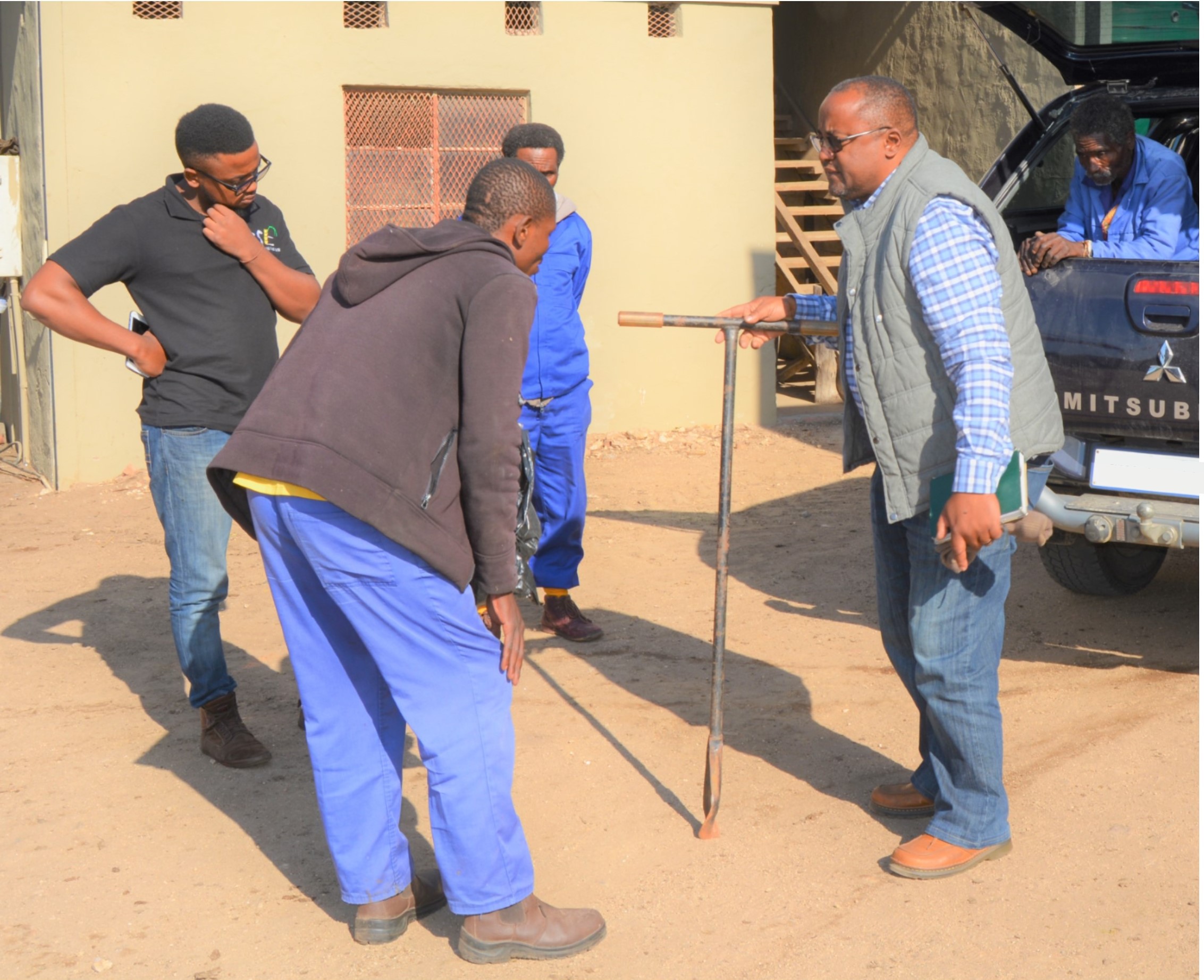 Lime is applied several weeks before replanting, as per soil sample recommendations. It is standard practice that all harvested fields, that will be ratooned, get no less than 2 tonnes of lime every season. Thulas has an annual standing order for 120 tonnes of lime which he uses generously on all fields. To this point, he hasn’t done deeper soil samples but, today he collected the auger for subsoil sampling from Mr Joe Nkala (Extension Officer) to facilitate these deeper soil samples. These will tell him whether he needs to apply gypsum with the lime in future. Below is Thulas explaining to Bongani Shezi how to use the auger for deeper sampling.