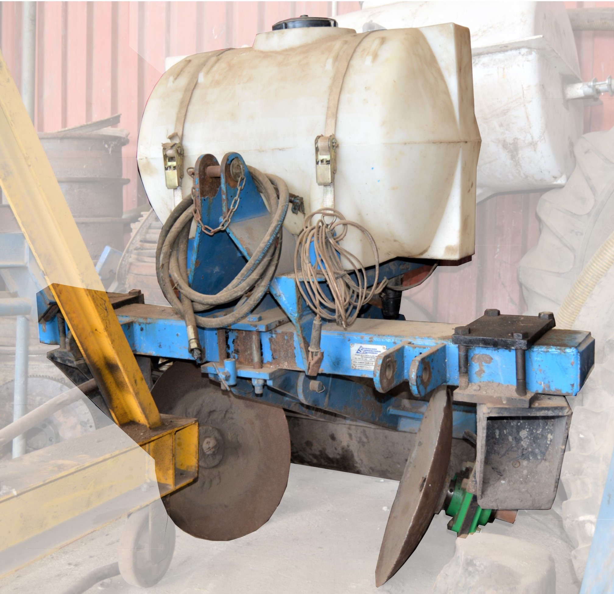 So, once the field is ridged, cane is placed into the furrows and cut into billets, fertiliser (usually a 2:3:4, depending on soil samples) is placed into the furrow. Bandit, for the control of thrips, is sprayed onto the cane, through knapsacks, and the furrow is closed with a tractor-drawn closing tool. One man follows behind with a hoe, ensuring that the furrows are closed properly. This closing tool is the same as the one that one of our other top farmers recommended – Thulas says it saves him 18 units of labour. I have tried to isolate the implement from those around it in the picture below.