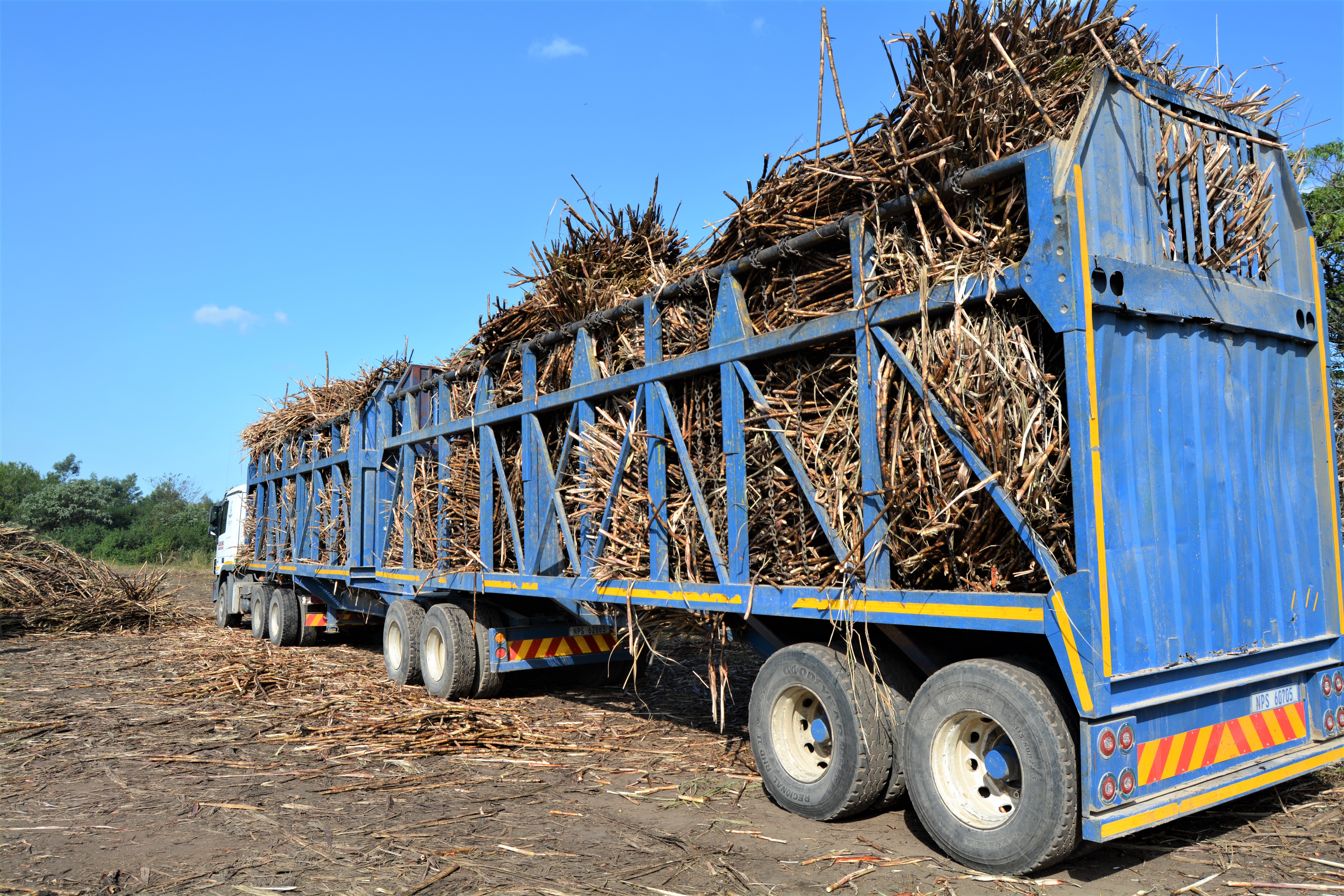 Cut and stack is the method used and tractor-drawn trailers transport to zone where the cane is loaded into trucks with a crane.