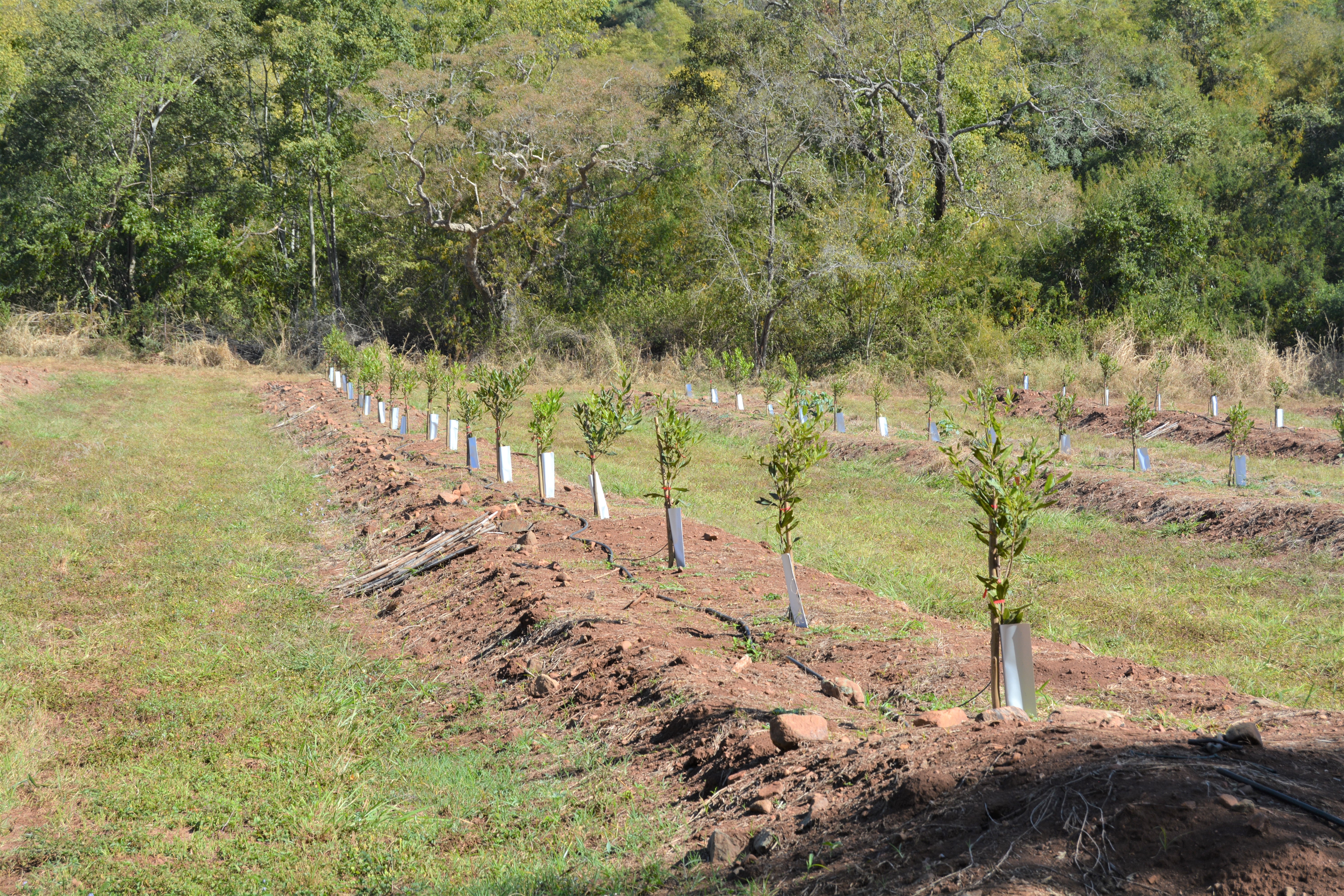 Jaff also sprays “Screen Dew” onto the young trees every 3 to 4 weeks until they are 3 years old. This was developed as a sunscreen (for trees) but has also proven useful in preventing frost damage during winter. This is hand-applied using knapsack sprayers.