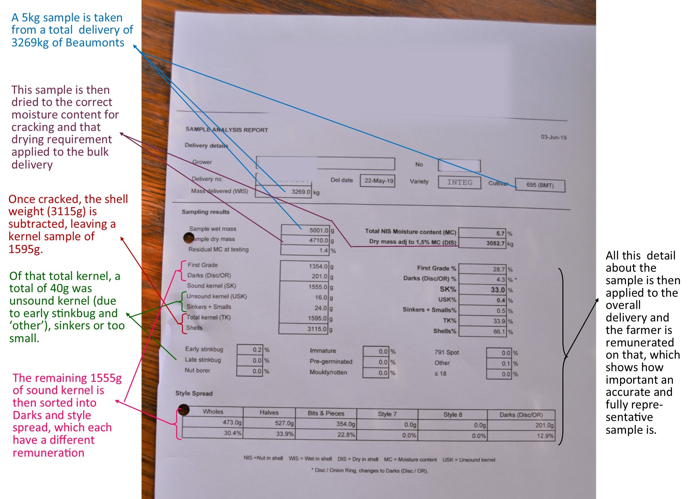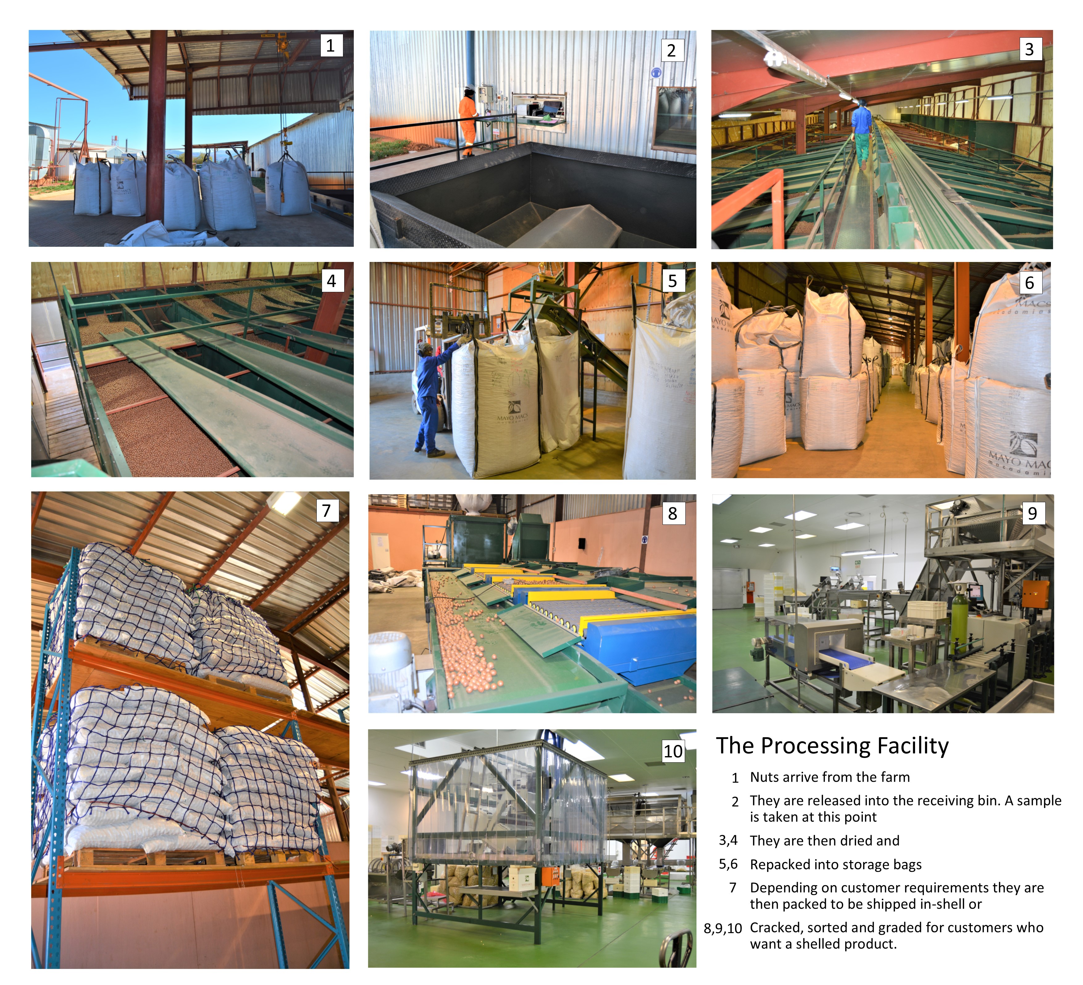 • Moisture content of nuts received is important as it affects how much supplementary drying the processing plant must do.