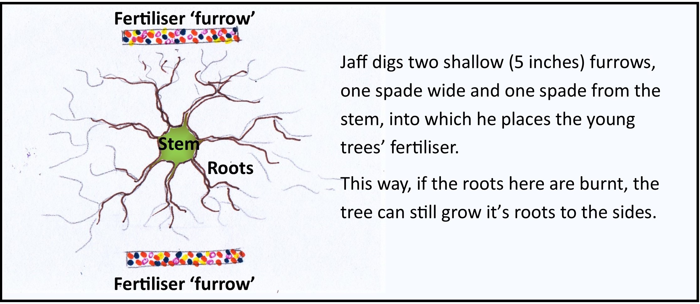 This general fertiliser has a broad range of elements and lasts up to 6 months although Jaff only applies  it annually, in August / September for the first 3 years of the tree’s life. In addition to this, a foliar feed is    sprayed on ‘every now and then’.