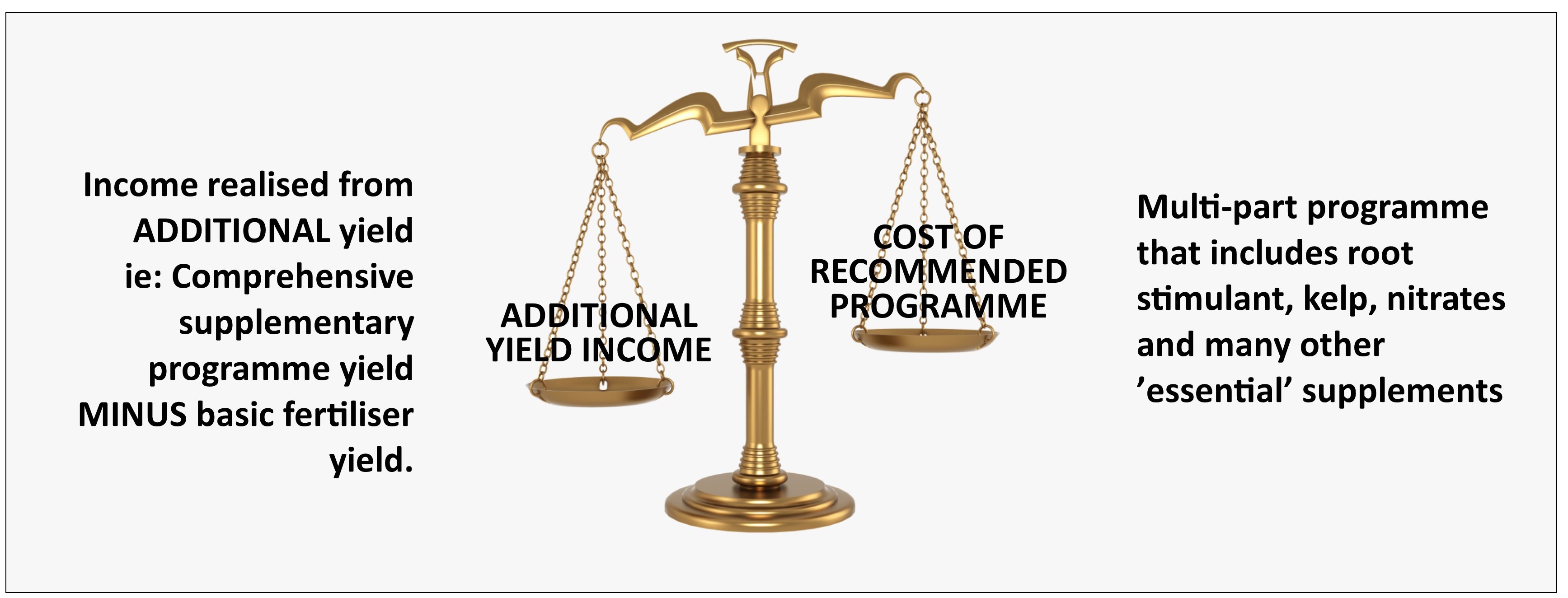 In Jaff’s experience, the multi-part programme would cost around R15000 per hectare per year. His LAN option, only R2000/hectare. He does not believe that the more expensive programme would deliver more than R13 000/hectare, in yield, and is therefore not a wise investment.