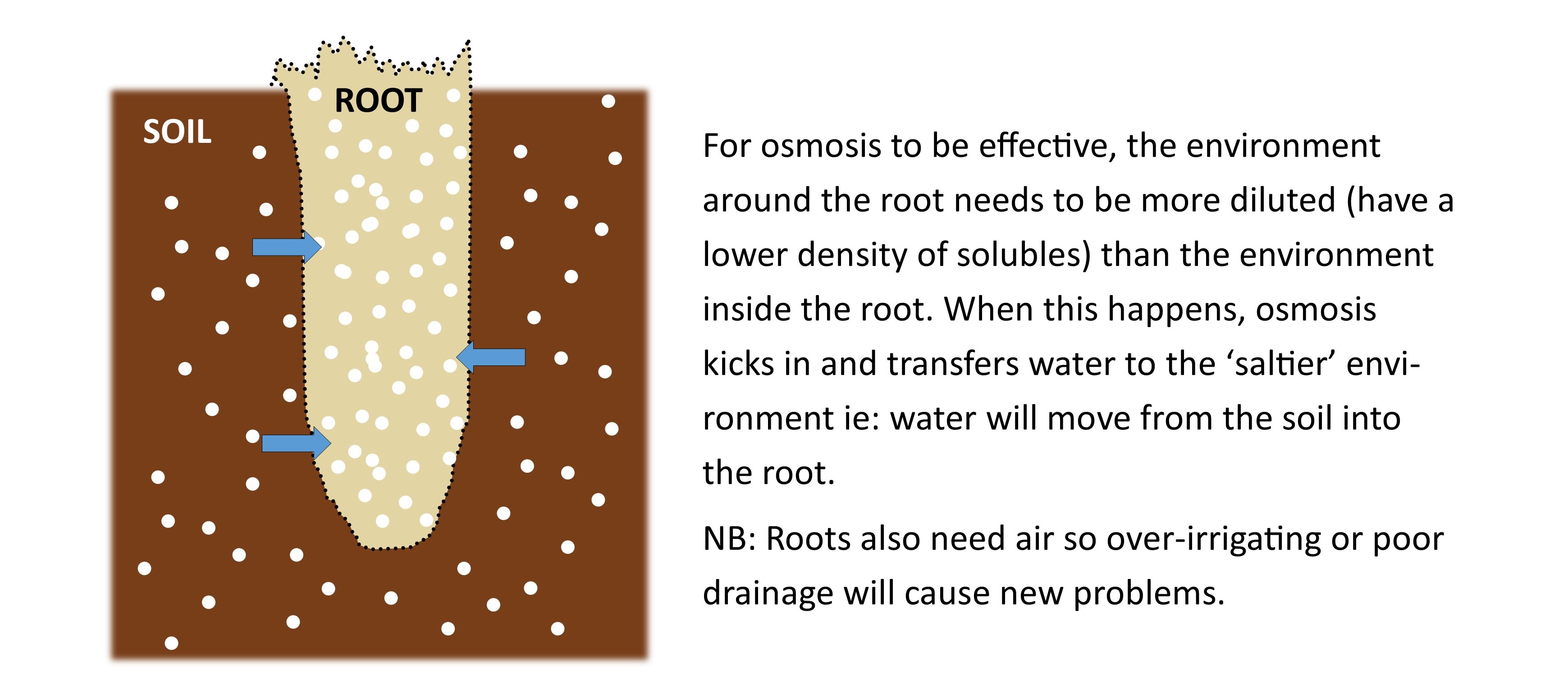 As usual, I am going to be bold enough to share something that most of you probably already know, but that I found interesting, and maybe there are a few others who can learn from it: roots take up water by osmosis. For this process to happen effectively the concentration of solubles in the soil surrounding the root need to be lower (more diluted) than the concentration of solubles in the root.