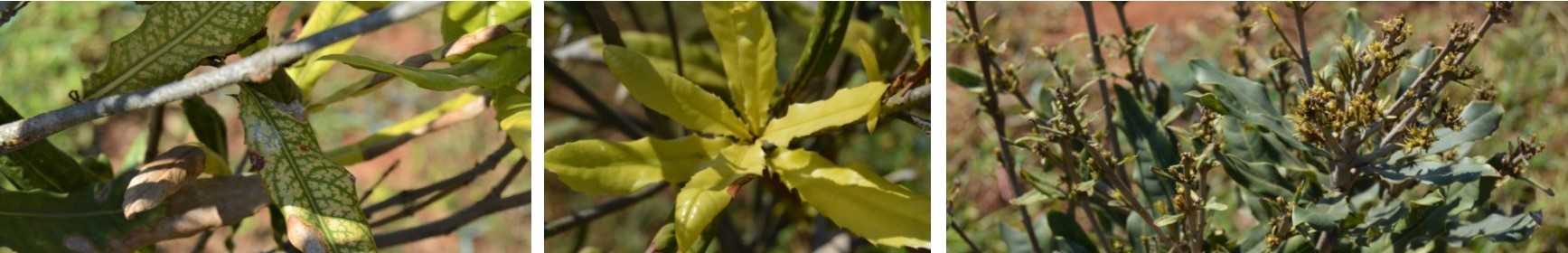 Left: Manganese deficiency (but it does look like tree was negatively affected by something else and it may be showing Iron deficiency on the other leaves) Centre: Iron deficiency Right: Although this presents like Glyphosate (Roundup) damage, Jaff says that this tree has been repeatedly browsed by duiker, giving it this appearance.