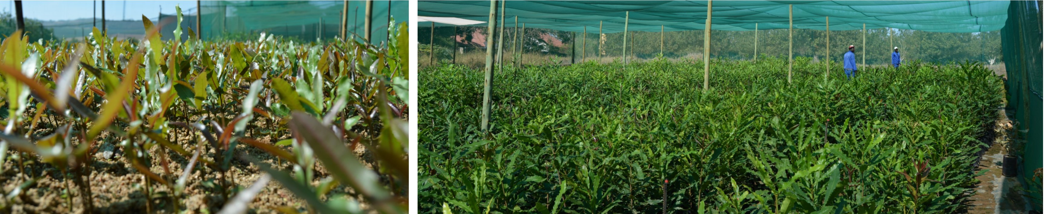 Left: 3-month-old root stock. After trialling numerous substrates, and combinations thereof, Jaff has established that river sand is the best. Right: Beaumont trees ready to be grafted.