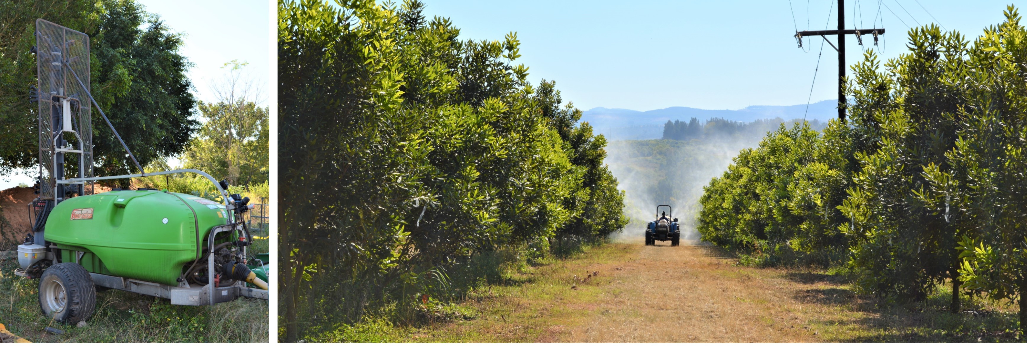 Jaff uses a Jacto 2000 airbus (on small trees) and a 3000 Florida (works with a tower) on the larger trees.