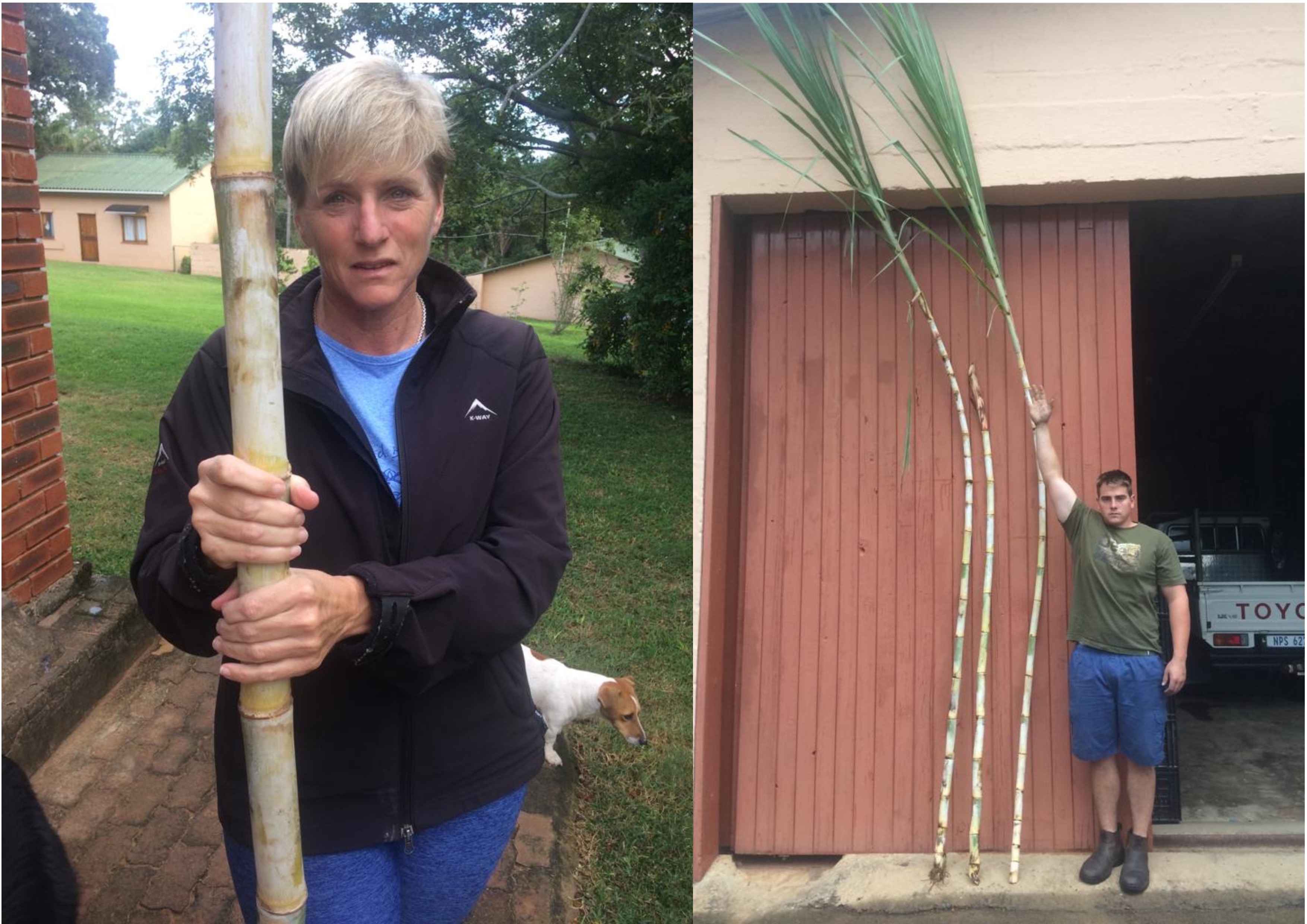 Megan and Justin provide perspective of this mammoth cane. It was N55 plant cane at 16 months old. The valley-bottom-benefits clearly visible.