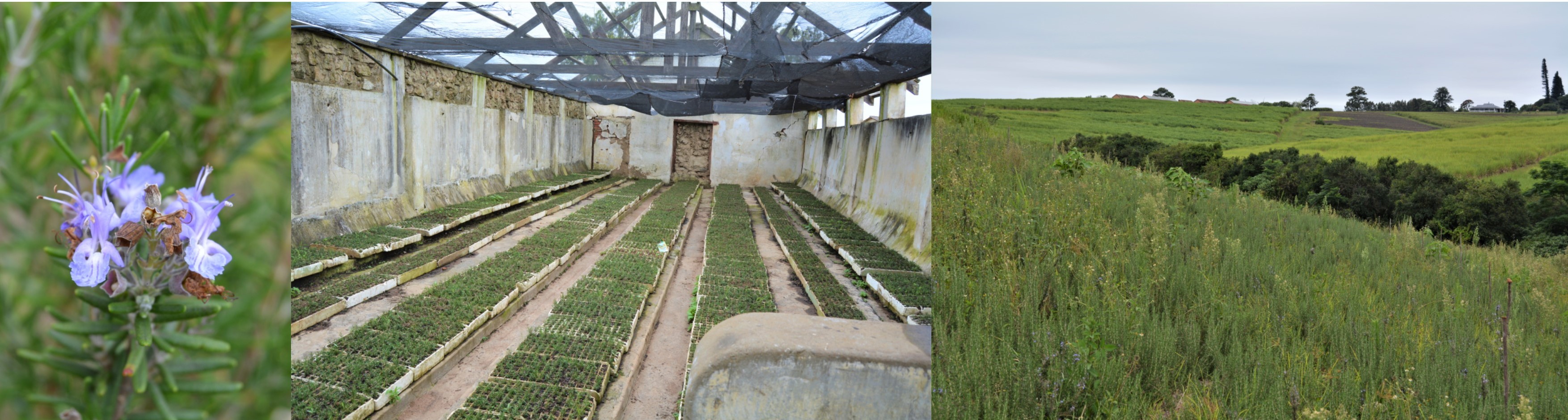 Left: A Rosemary flower. Centre: Two hectares of Rosemary that Daniel has propagated himself. Right: The one-hectare trial he will harvest at the end of March.