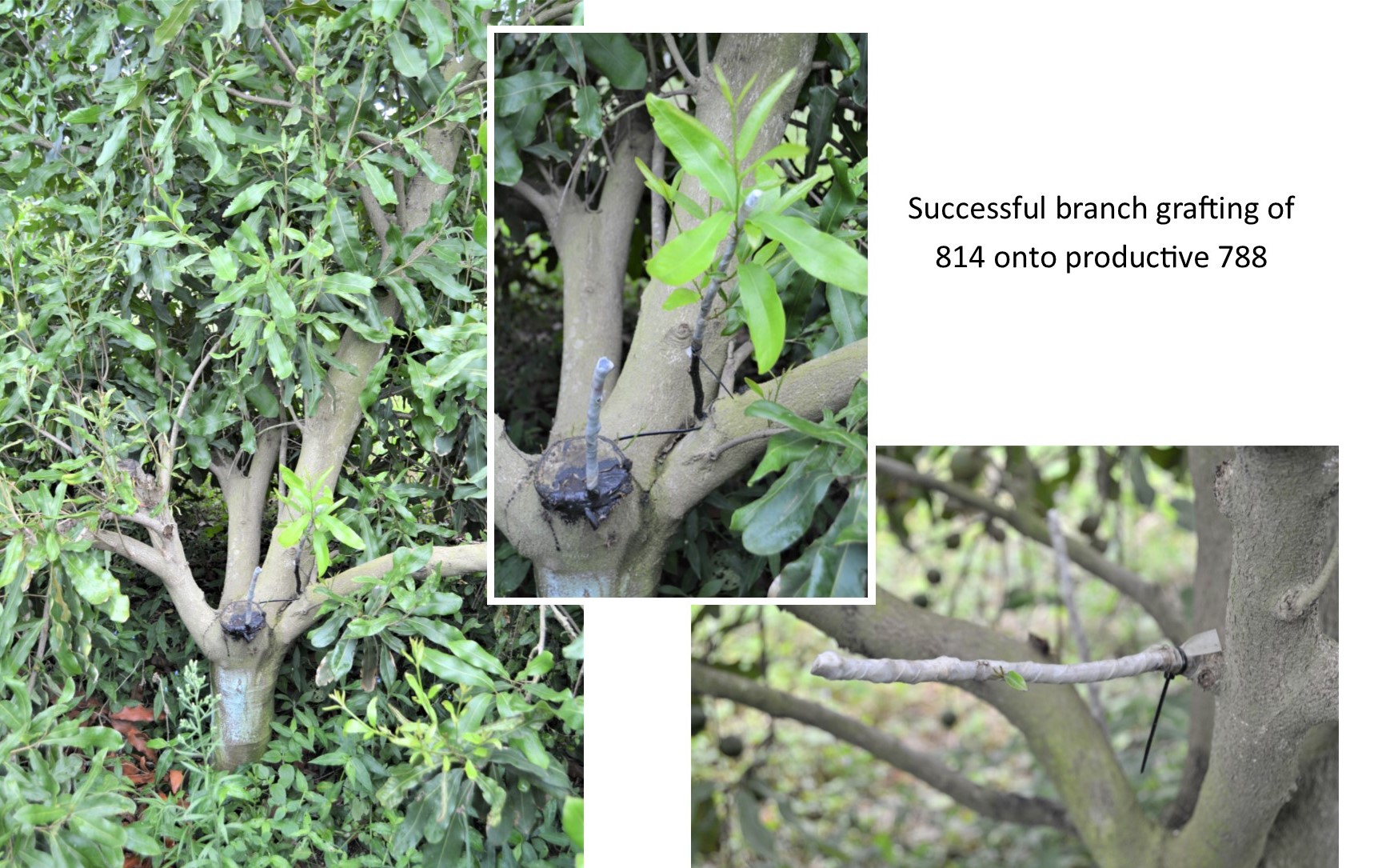 Now this is fascinating; Jaff has been trialling branch-grafting. The motivation is that he wants to maintain uninterrupted production whilst changing a cultivar. So, the 788s that Jaff would like to replace are having a low branch removed. He then grafts 814 budwood onto the severed branch. The rest of the tree is still producing 788 nuts but, eventually, the 814 will take over.
