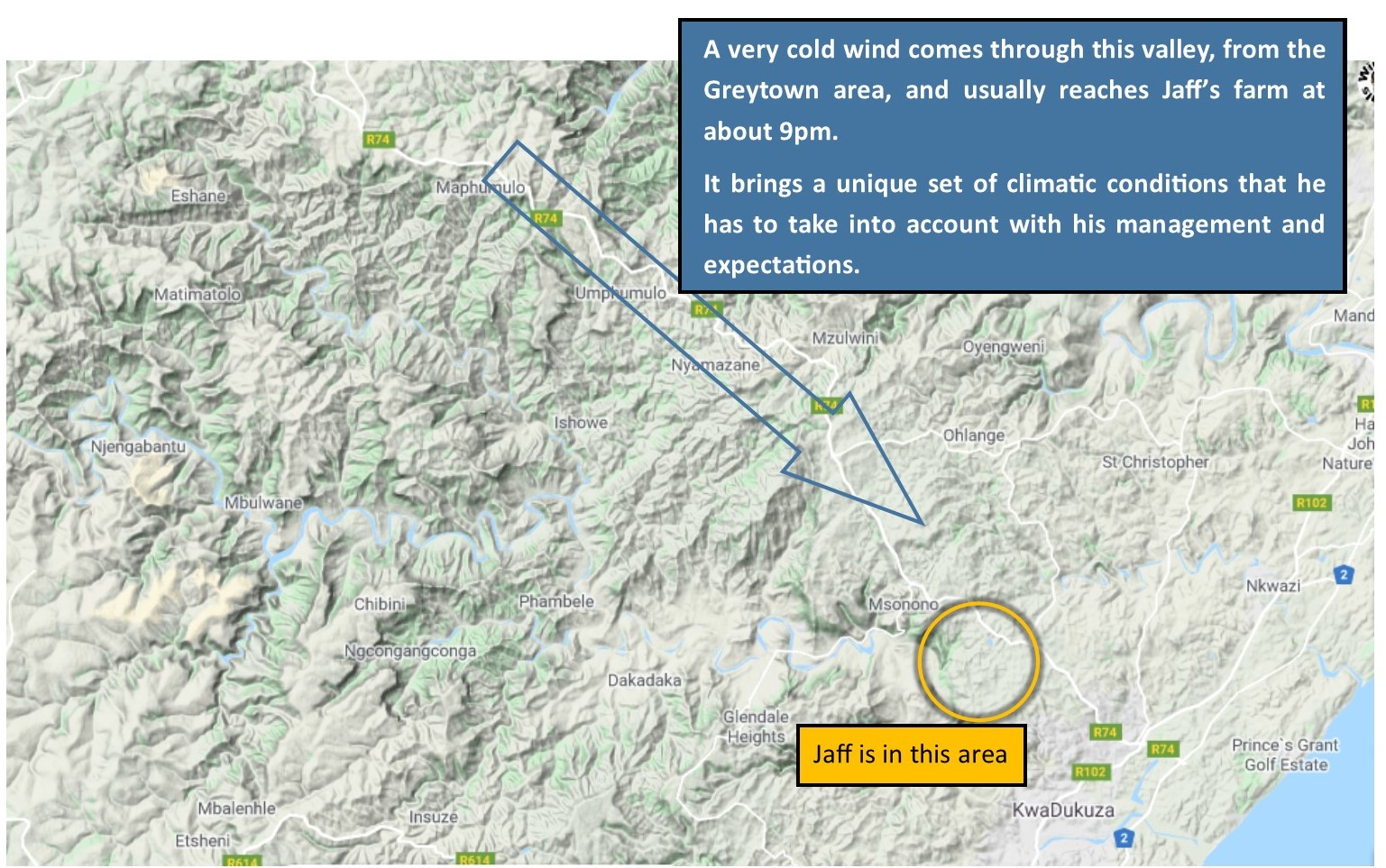 The Umvoti river creates the border on one side of the farm. In winter, conditions can turn very cold. When temperatures drop in Greytown the air sinks through the valley and replaces the warm air with very cold air, usually at about 9pm. It drops to about 10 to 12 degrees but the wind chill is freezing. On the farm next door, there’ll be not a breathe of wind, but, on this farm, it is a freezing-cold gale. Jaff is aware that everything from insects and fungi to tree growth and nut development must be affected by this chill.