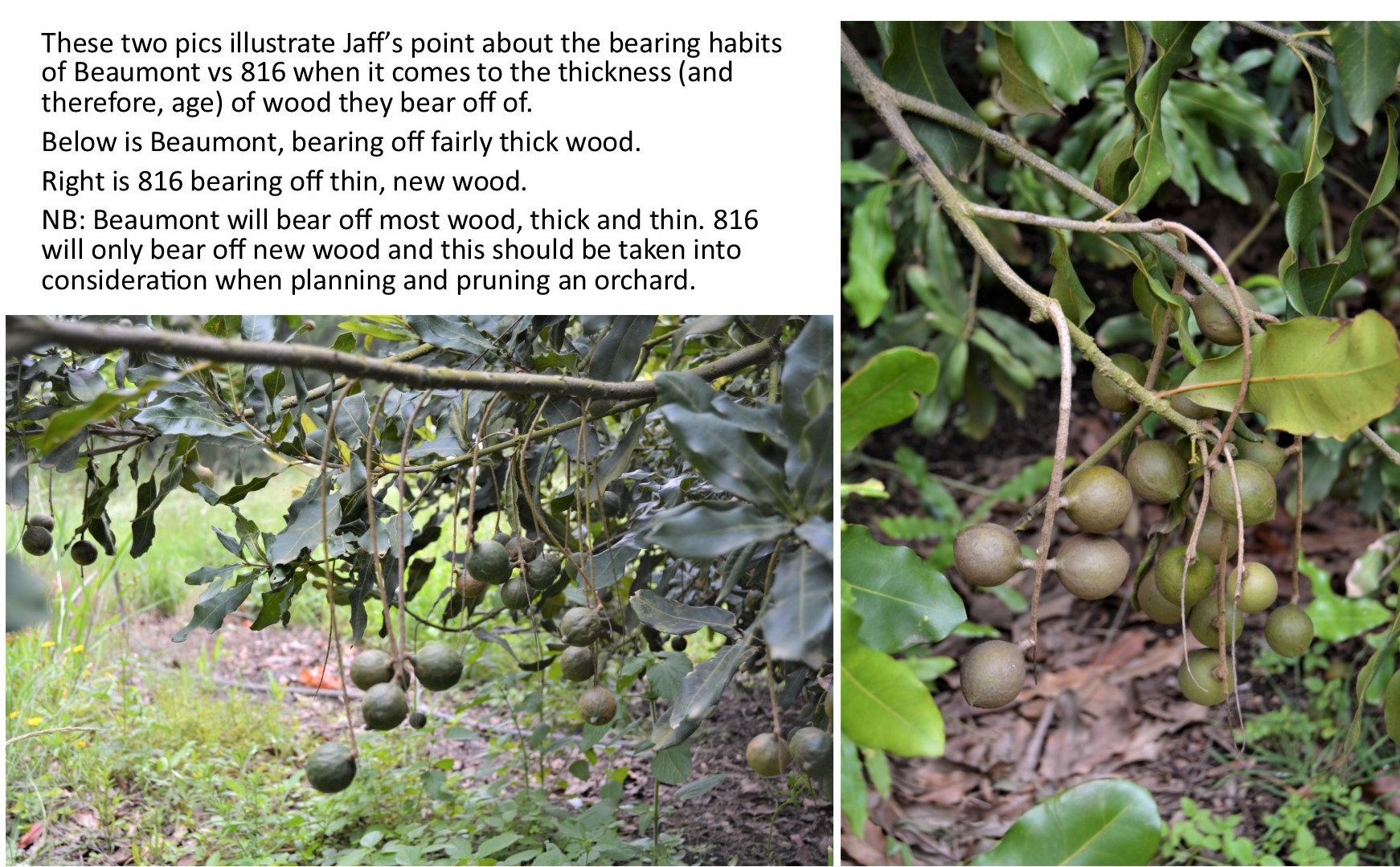 Jaff uses ethapon on the majority of his macs. The 816s, because of their highly sensitive nature, and some 814s that may not look up to the challenge, escape but all the Beaumonts and 788s are sprayed to encourage nut drop. Having interplanted varieties make this exercise challenging but Jaff sees value in being able to schedule the harvest and move in swiftly to get pruning done before flowering starts.