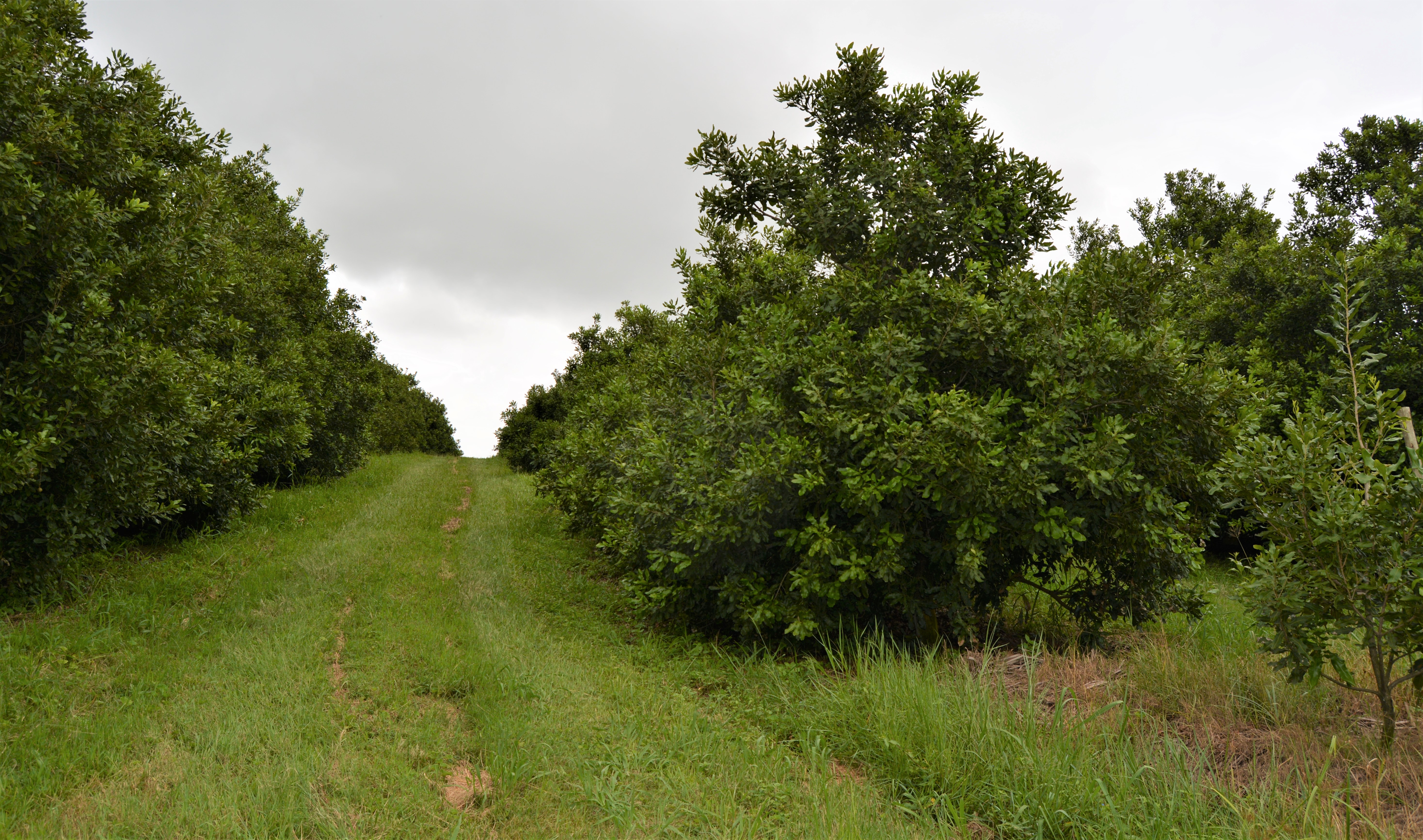 These trees get plenty of sunlight and the sprayers are not impeded by interrow growth. Notice also how low the skirts are, which helps to keep the roots sheltered from the hot sun and the soil moist. Jaff doesn’t “clean up” under these skirts so there is lots of natural mulching – further enhancing the environment for healthy root activity.