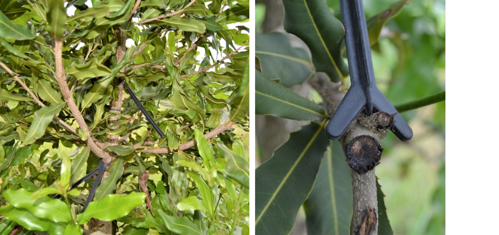 Another ingenious training strategy Jaff uses is to staple the young, pliable trees. Yes, you read right – he staples them! He says this works well to gently open a tree and lasts long enough to make a meaningful difference without any damage or excess labour incurred. In the picture above he shows where he would staple and how significant the effect is.