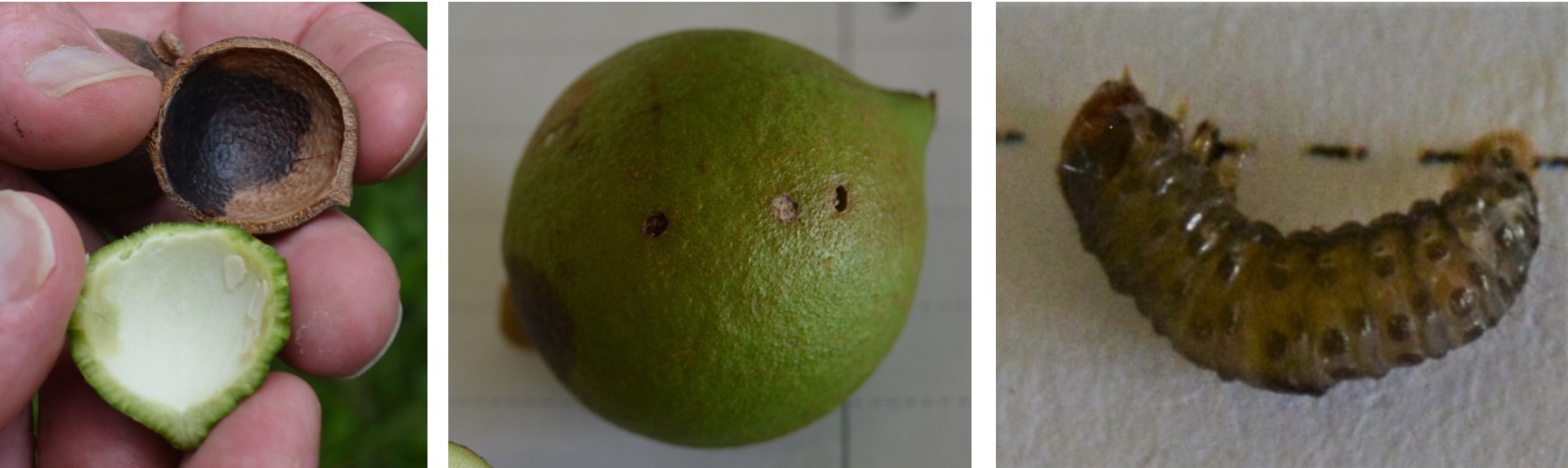 Left to right: Comparing a healthy husk to one that has been depleted by a nut borer worm who didn’t get past the shell, evidence of the nut borer’s entry, the criminal (in worm form).