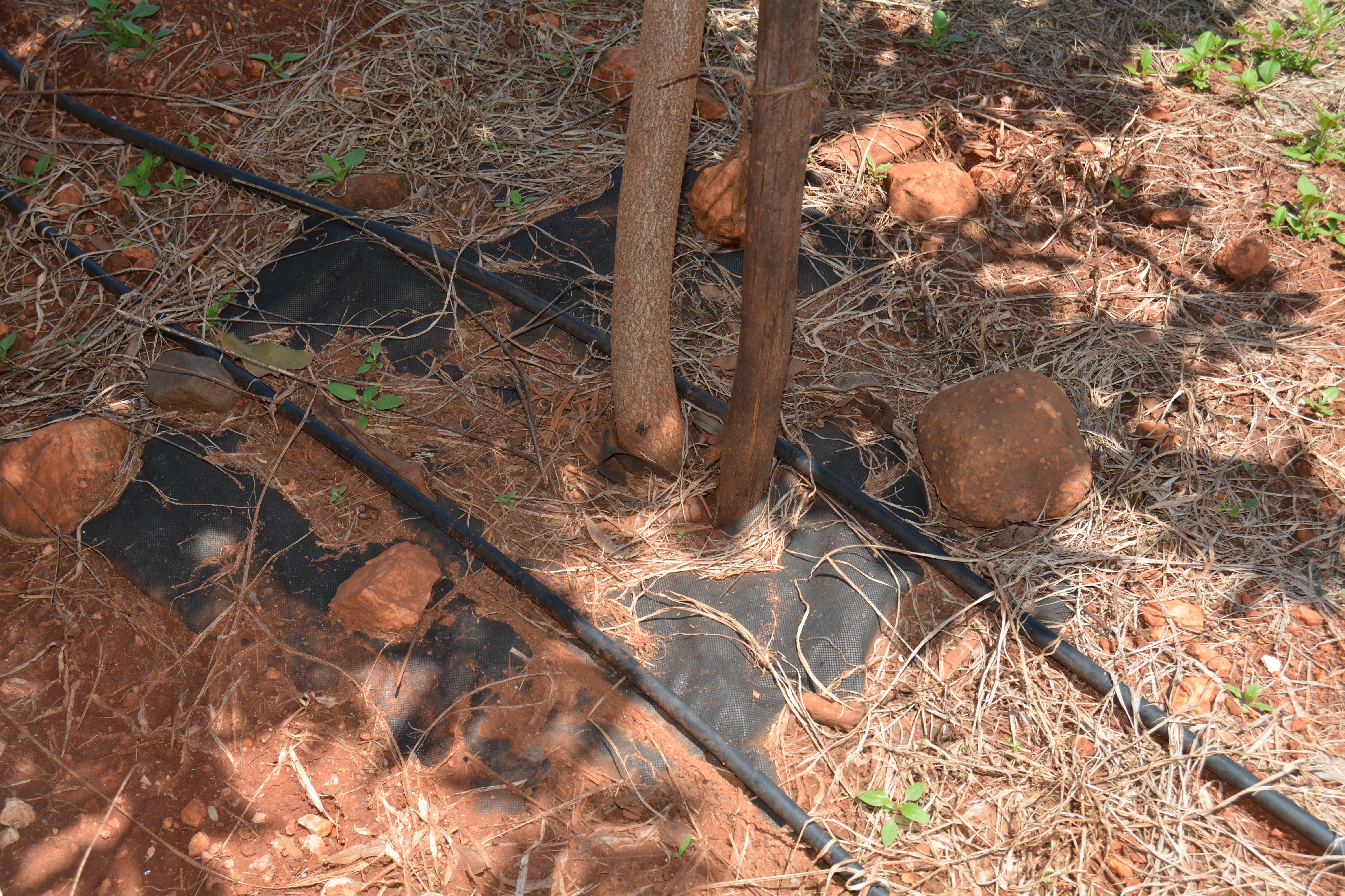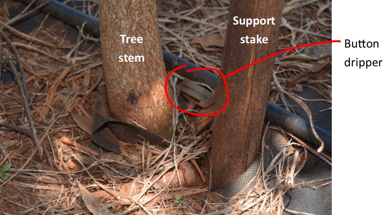 Each small tree gets a dripper which delivers about 2 litres per hour. The system in newly established orchards runs for about one hour per day. As the trees grow, the irrigation is run for longer each day.