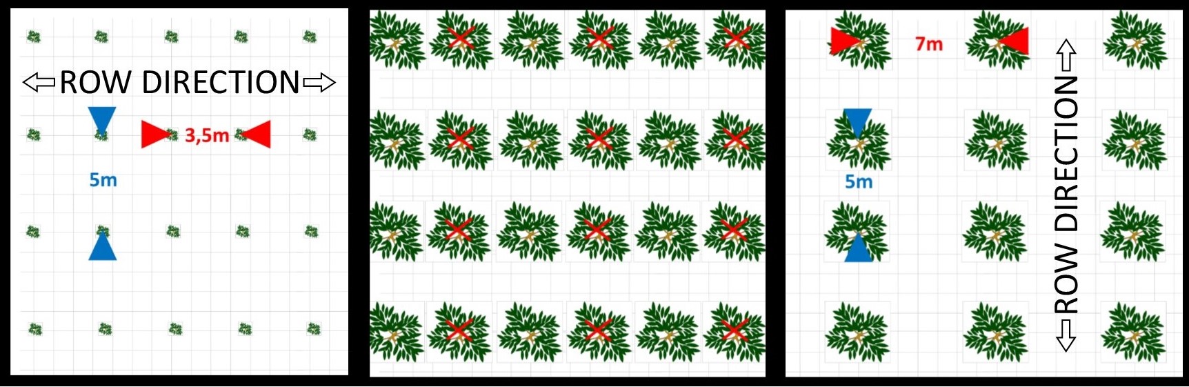 Left: Planting with a spacing of 5m x 3,5m. Centre: remove every alternate tree. Right: change row direction to end up with an orchard that is spaced 5m x 7m.