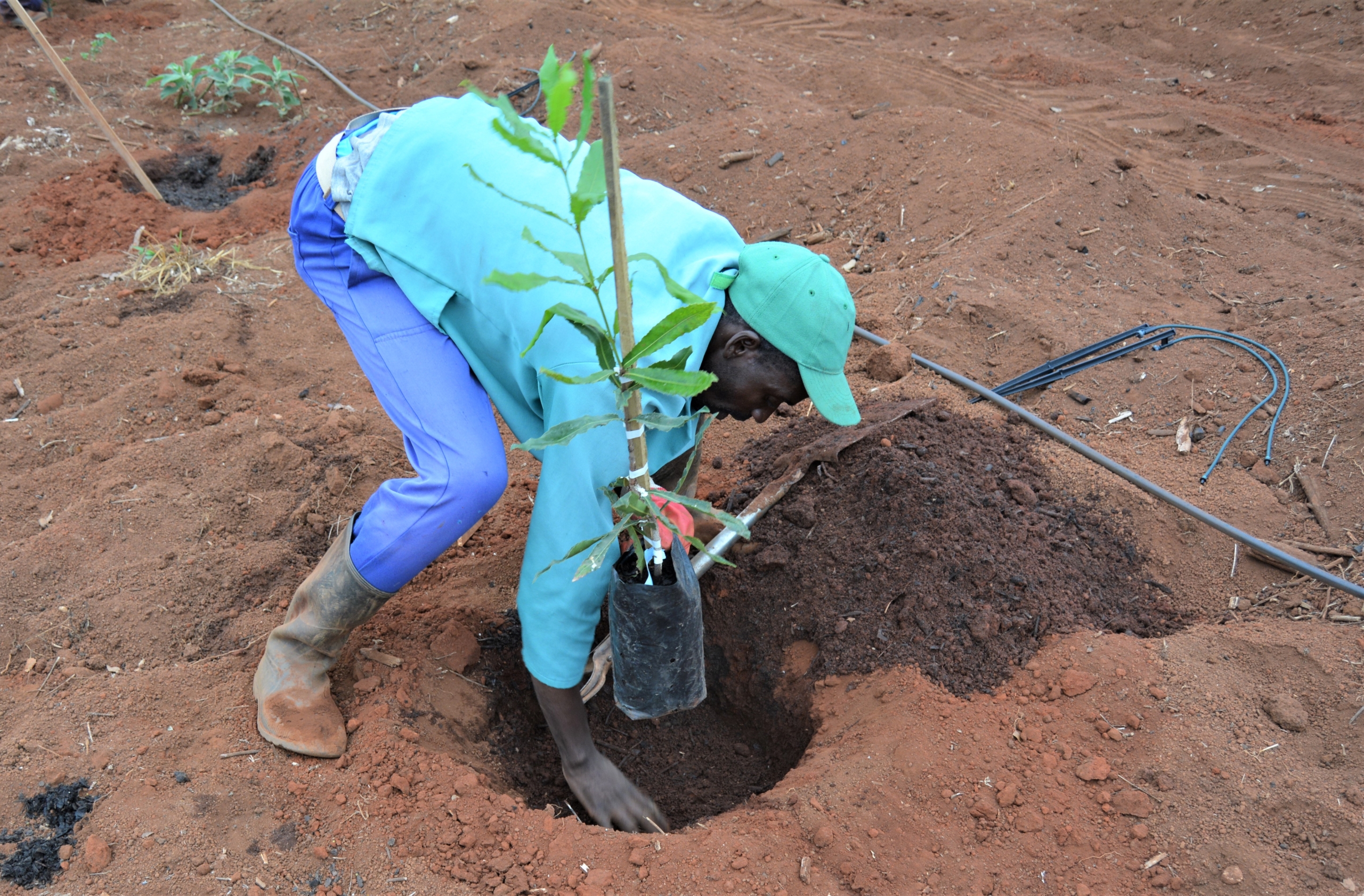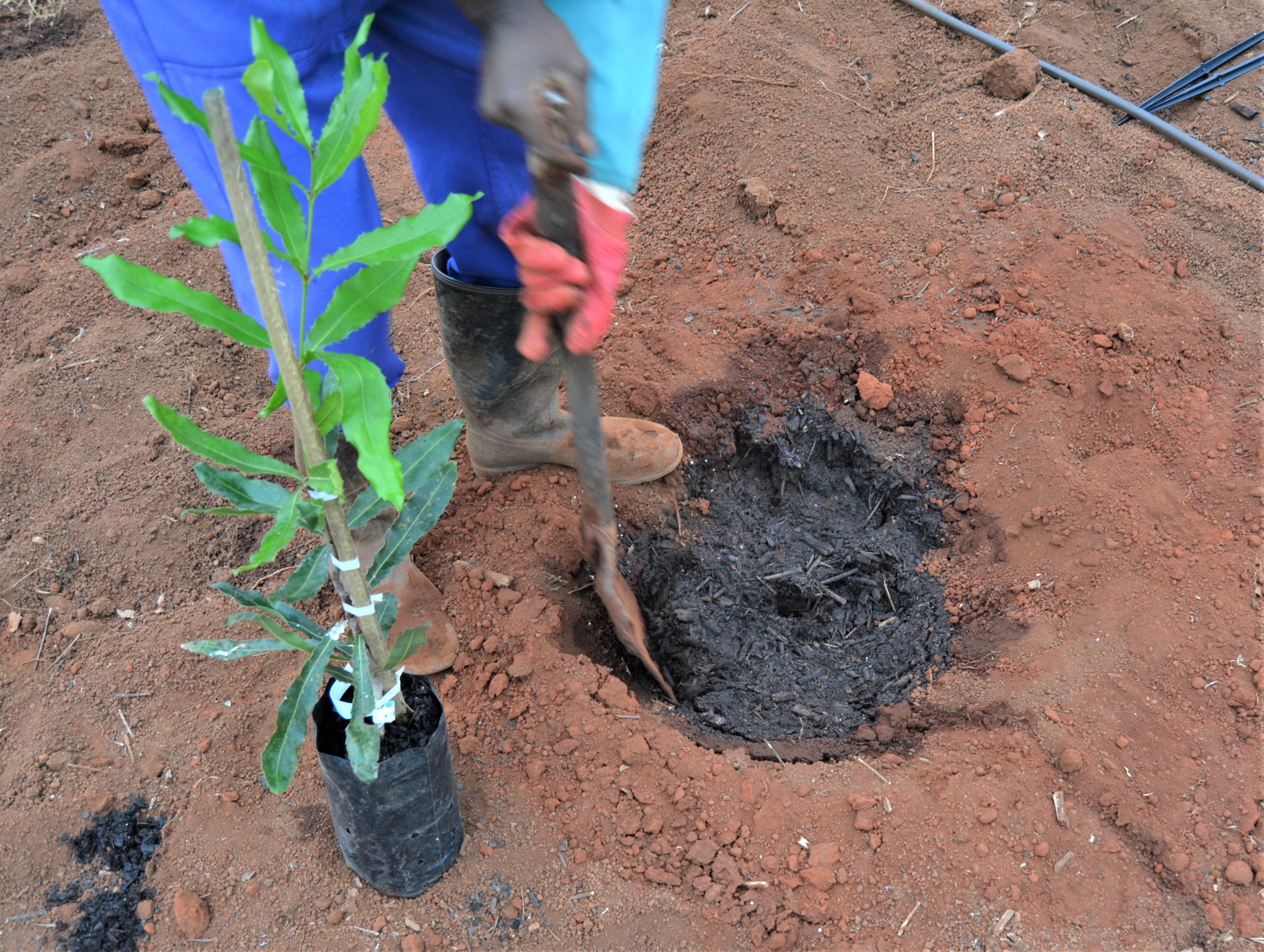 The tree is then staked and, within the next few days, the base of each tree will be covered with some more compost and wood chips. 2050 trees will take 18 men 4 days to plant and complete the establishment process.