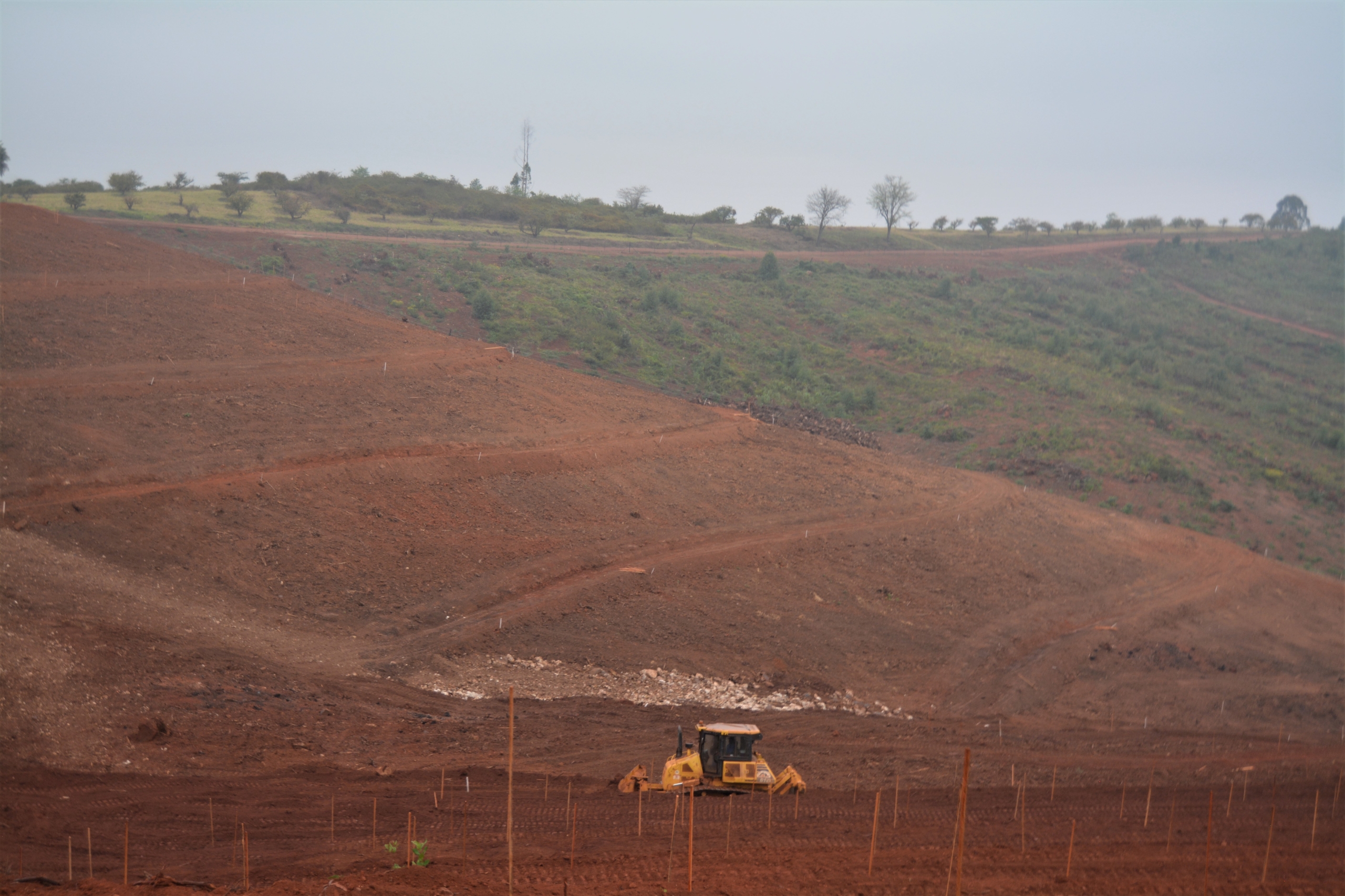 Here the ‘dozer is pushing rows between the contours. Jaff is concerned that it’s getting too steep as he goes down the hill. This is 4×4 planting (discussed under ‘Spacing’ below).