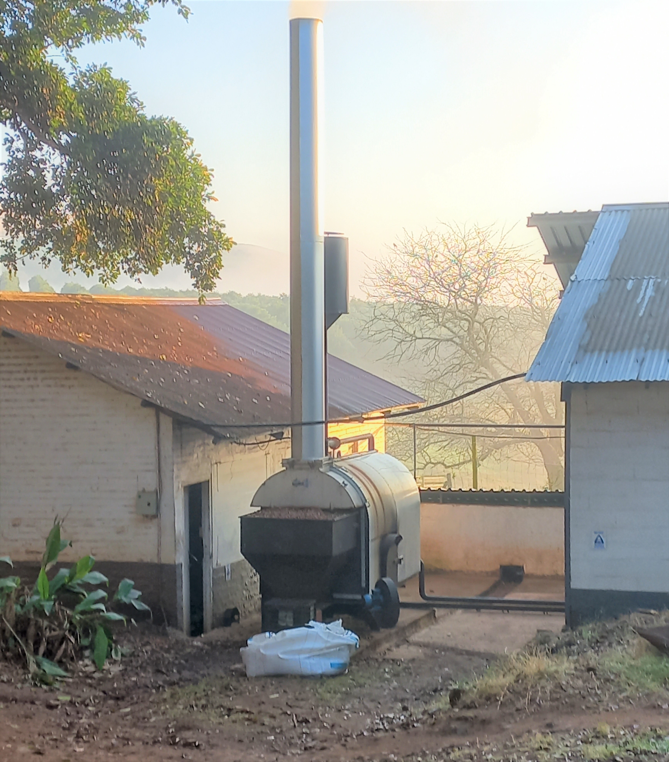 This boiler system is about 2 years old. Previously, Jaff was using hot air from the ceiling and circulating it through electrical elements in the duct but the heat wasn’t enough to dry the harvest timeously. Eskom’s high rates and unreliable delivery sealed the move over to the radiator system.  The heat is set between 30 & 35°C.