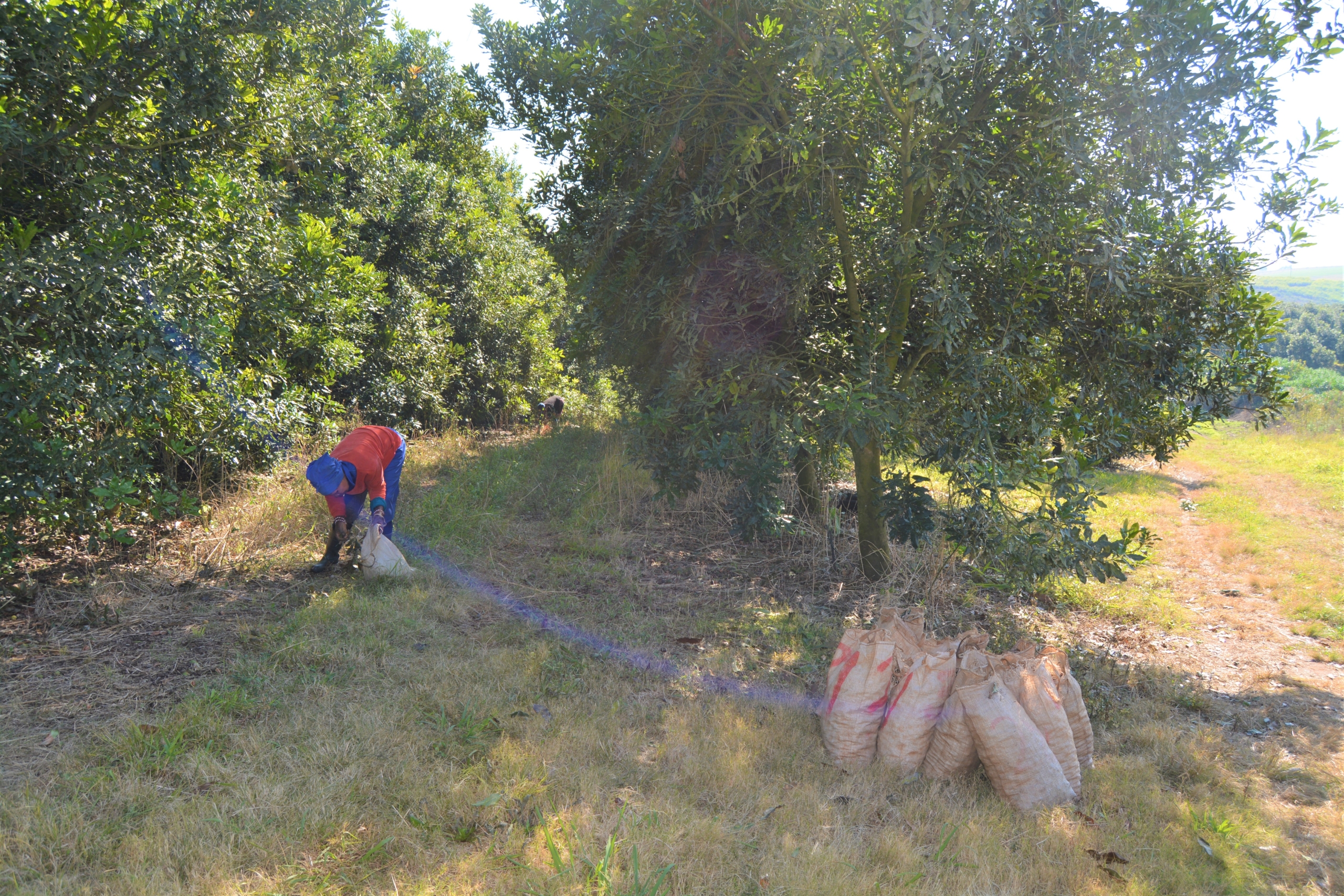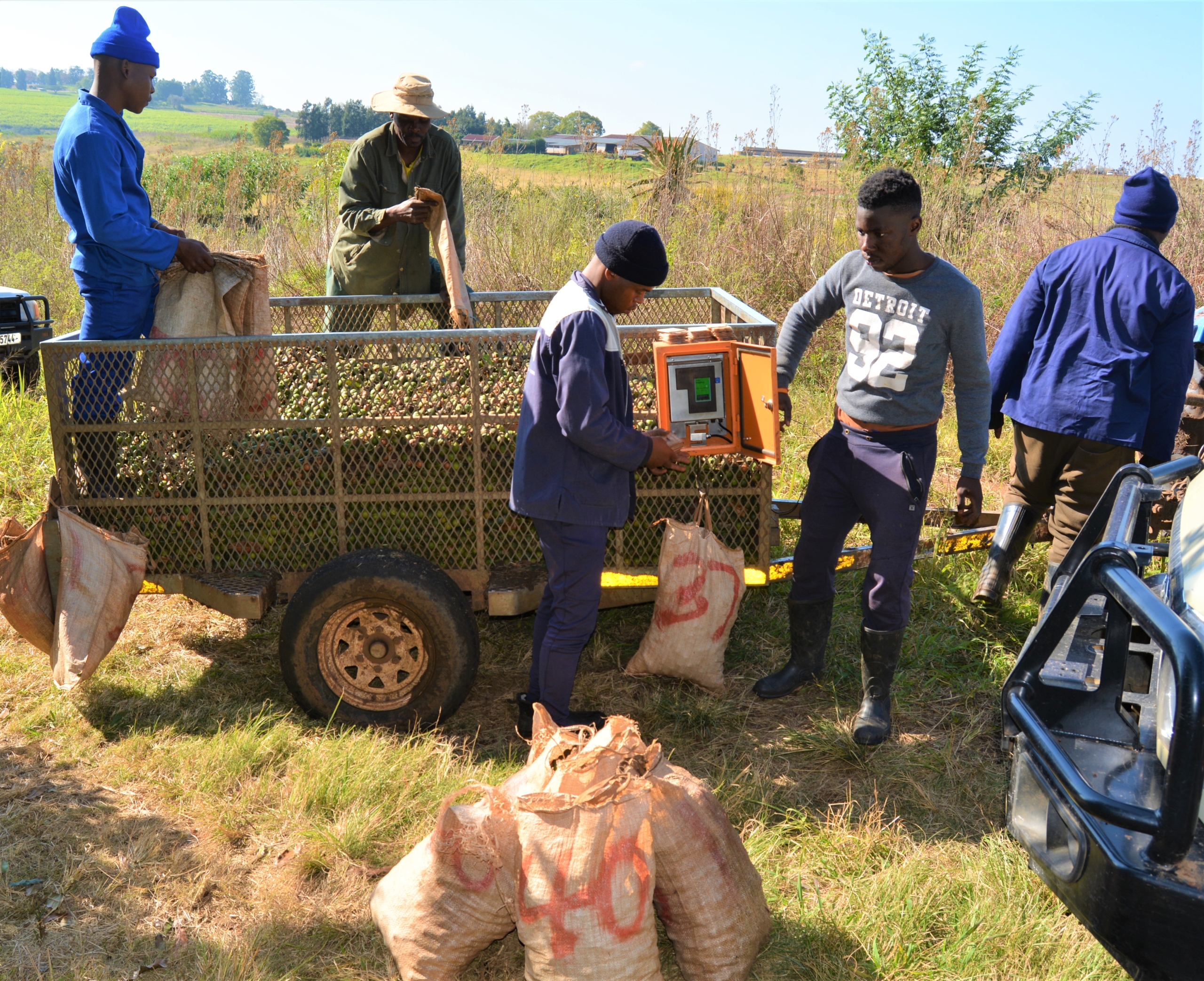 Pickers are issued with between 10 and 40 ten-kg bags each, depending on how much harvest is on the ground, and are free to go home when their bags are full (usually around midday). A trailer, with a scale, moves through the orchards and the numbered bags (linked to each harvester) are weighed and the nuts tipped into the trailer. When full, the trailer tips the load into a hopper. The bags go back to shed and the numbers are recounted to double check accuracy on record-keeping.