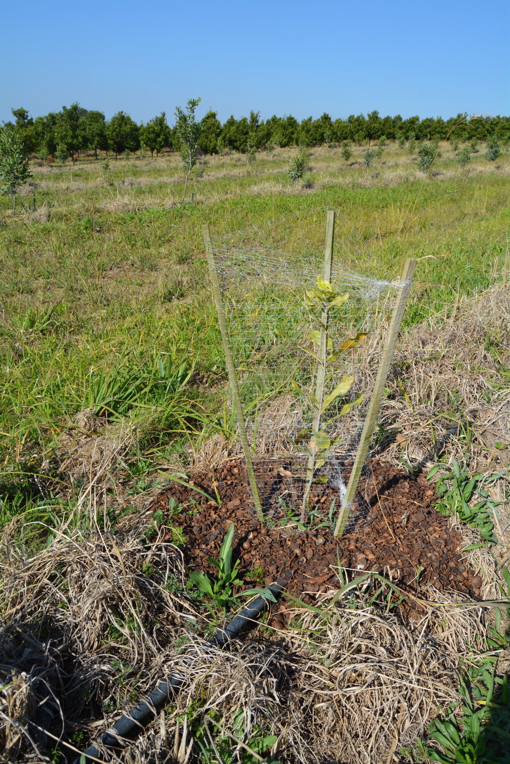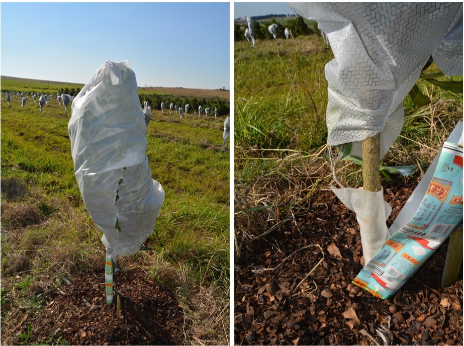 Jaff has since replanted in the same orchard (surrounded by a lazy ox-bow in the river where the air is very still and, clearly, deathly cold) but this time the orchards are better prepared; he’s wrapped the stems in ‘foam’ – the kind you find lining fruit boxes, sprayed the leaves with frost protector and wrapped the canopies in frost-protective blankets. He does this annually, and will carry on until at least year 3. The winter ‘dress up’ is left on for a month or two. The frost blankets can be reused in subsequent years.