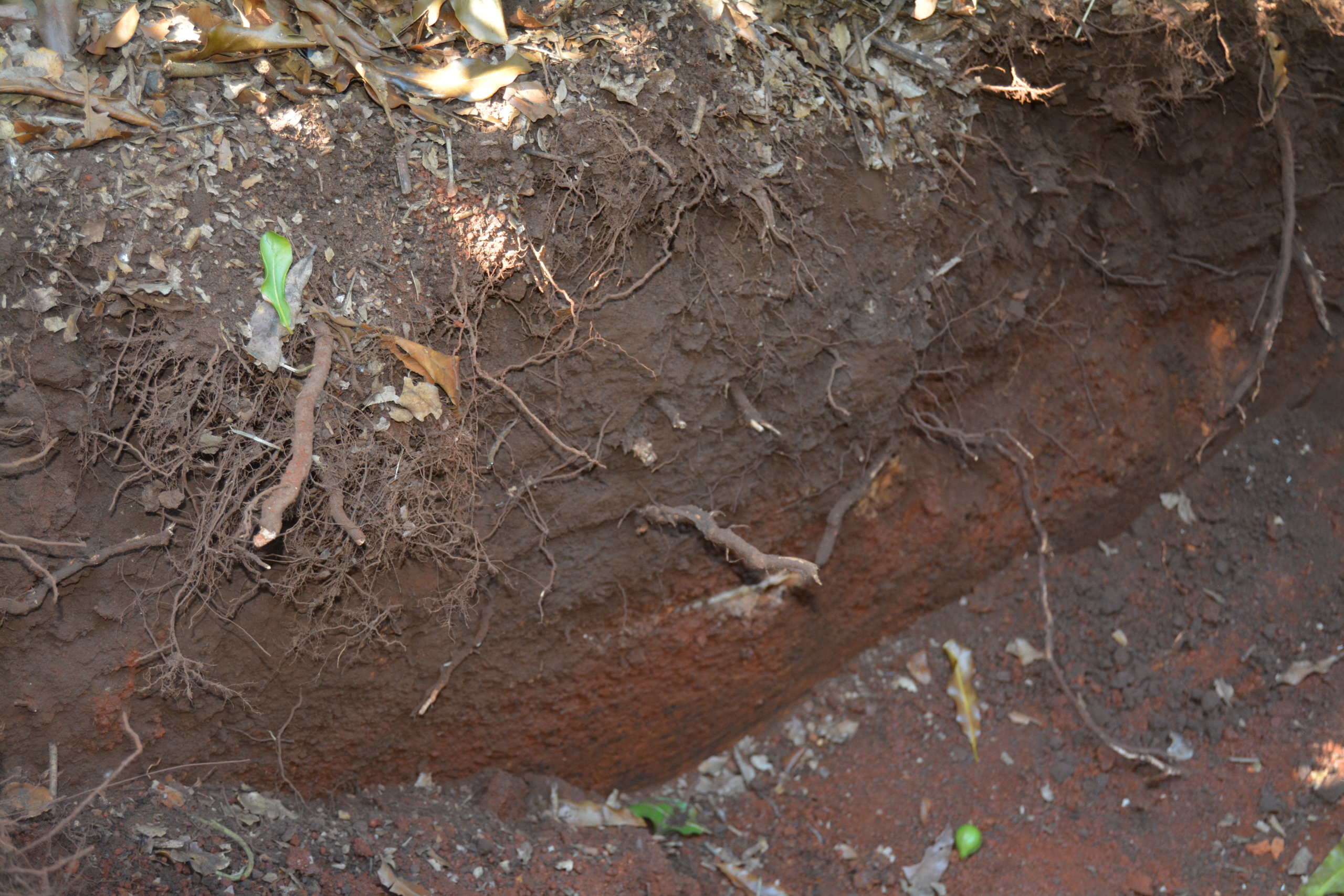 Jaff is encouraged to see how the surface roots are already using the organic matter he only recently (3 to 4 years) began adding to the orchards.