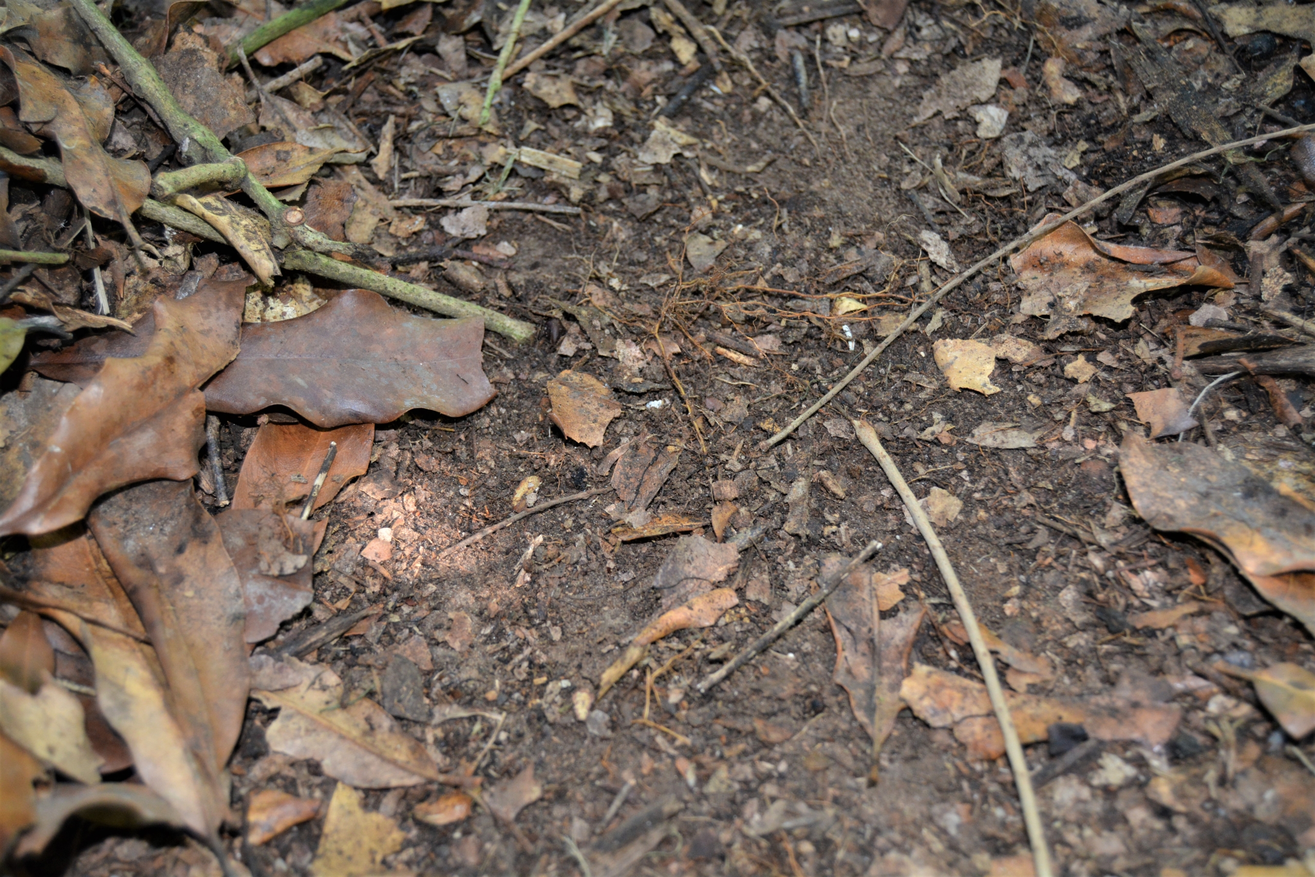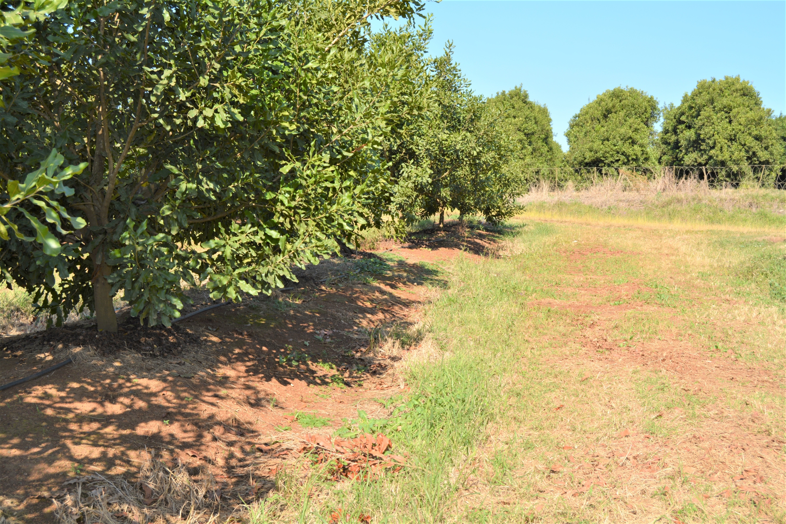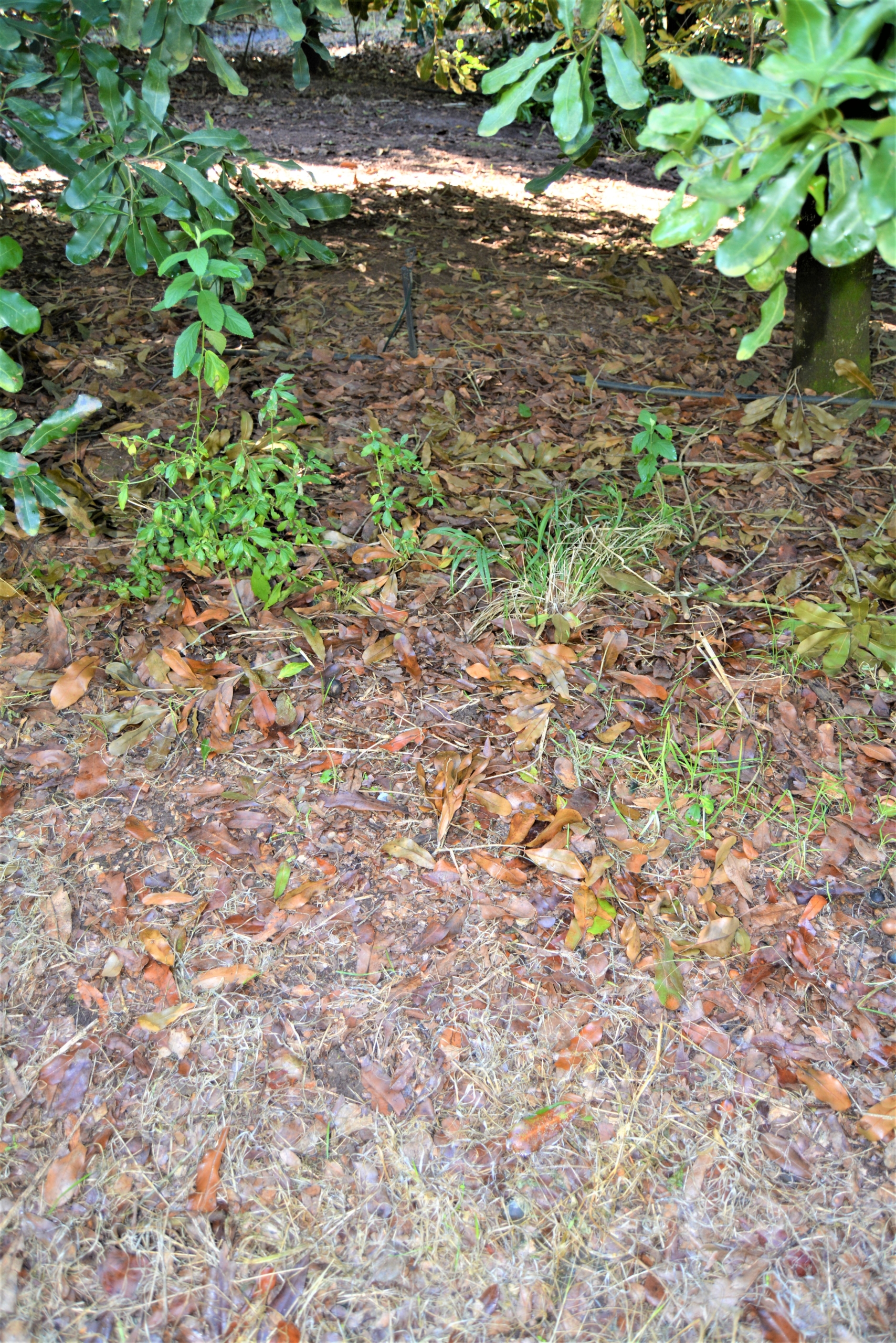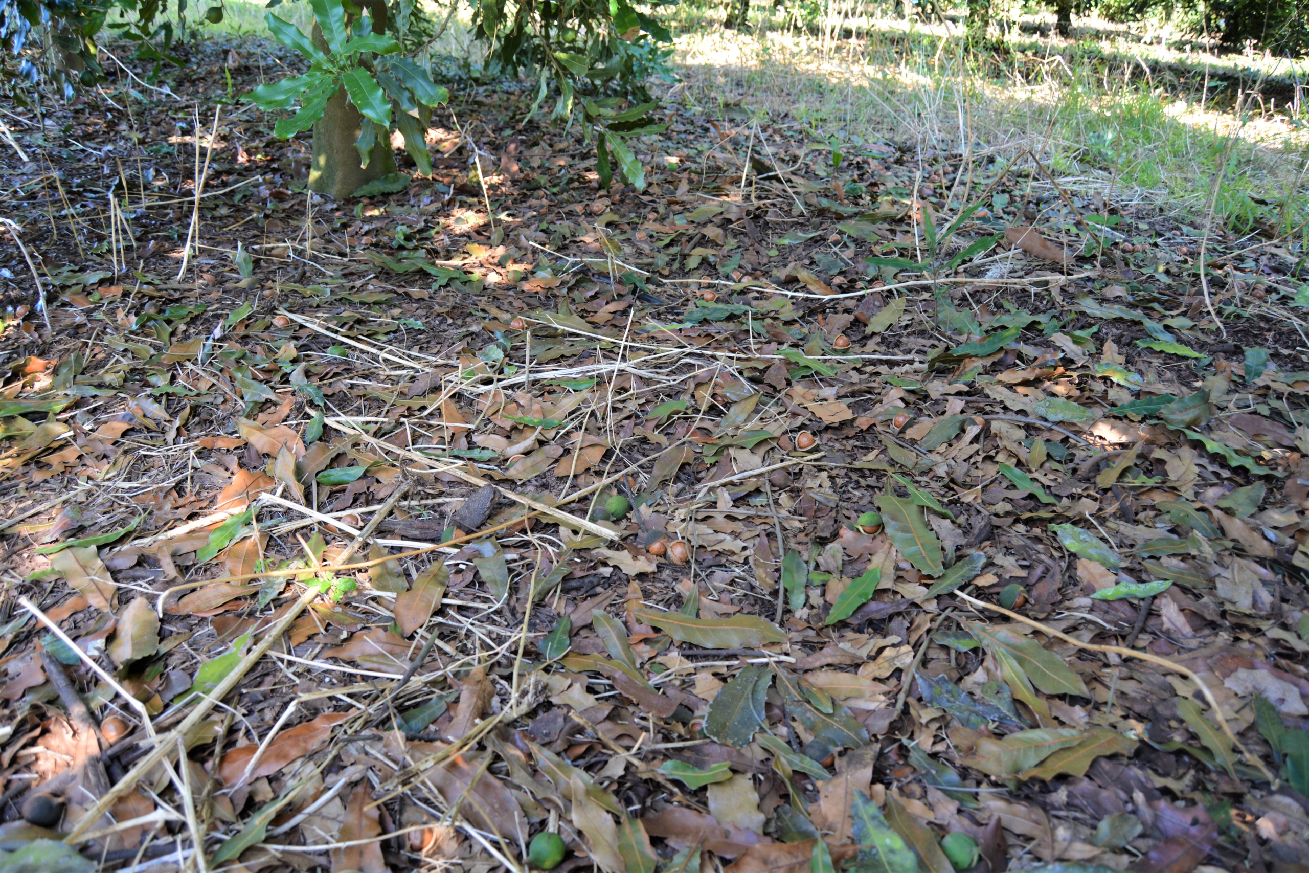 In this picture you can see how the mulched litter in the foreground makes it easier to see fallen nuts but that it remains challenging in the unchipped litter around the irrigation piping running in line with the stems.
