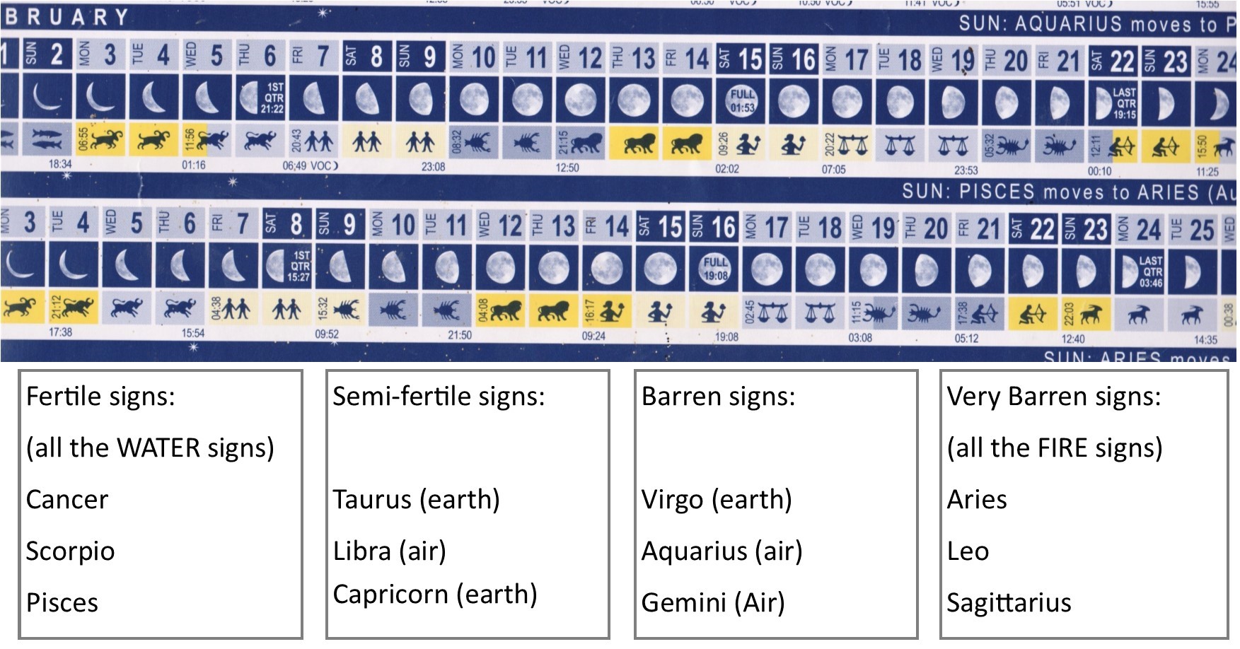 There’s a calendar chart they use, supplied by Moontime (www.moontime.co.za), which gives detail pertaining to every day of the year. From this it can be ascertained what activities are recommended and which would have better results if done in another phase of the moon. To explain this more clearly, I have taken the basic lunar rules from the Moontime website: