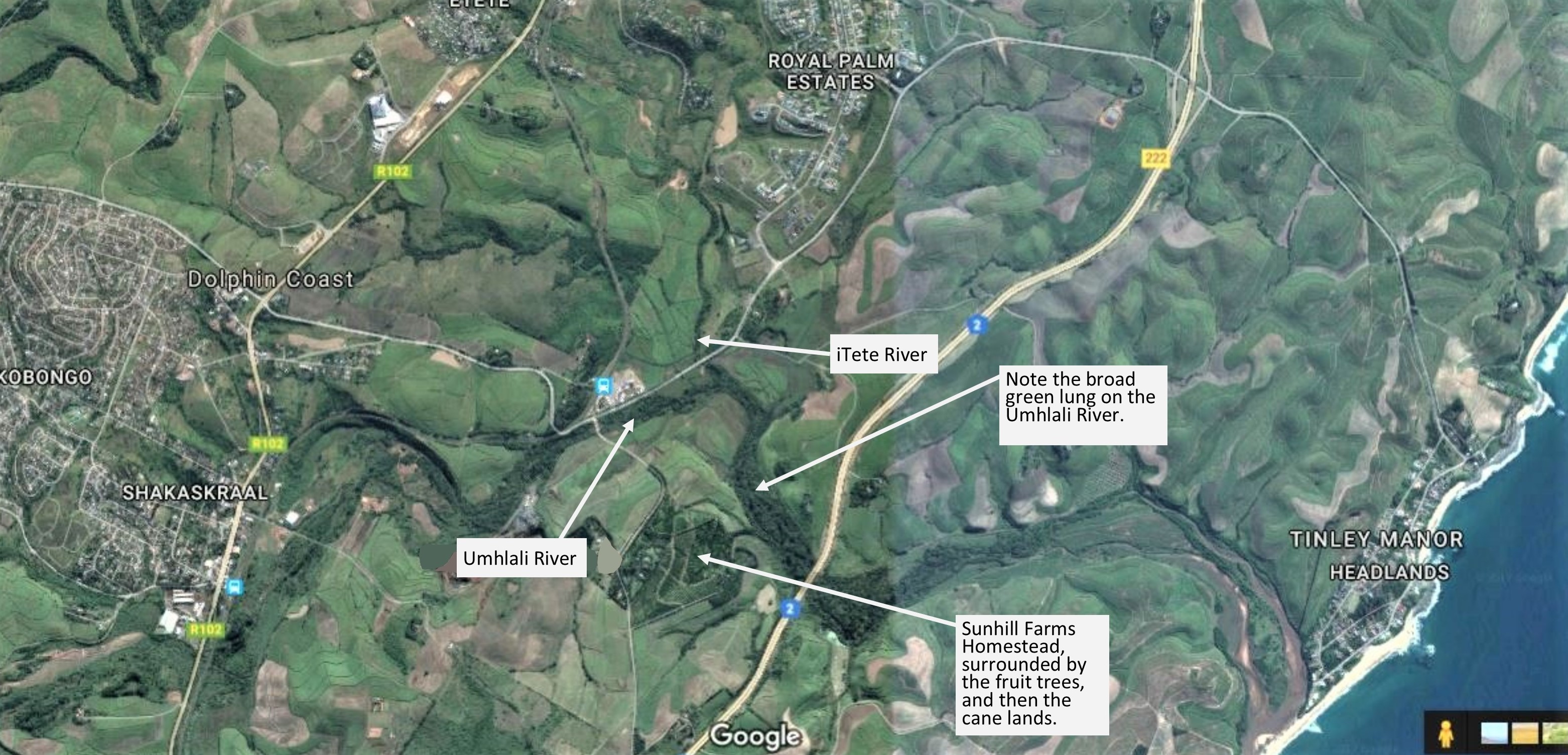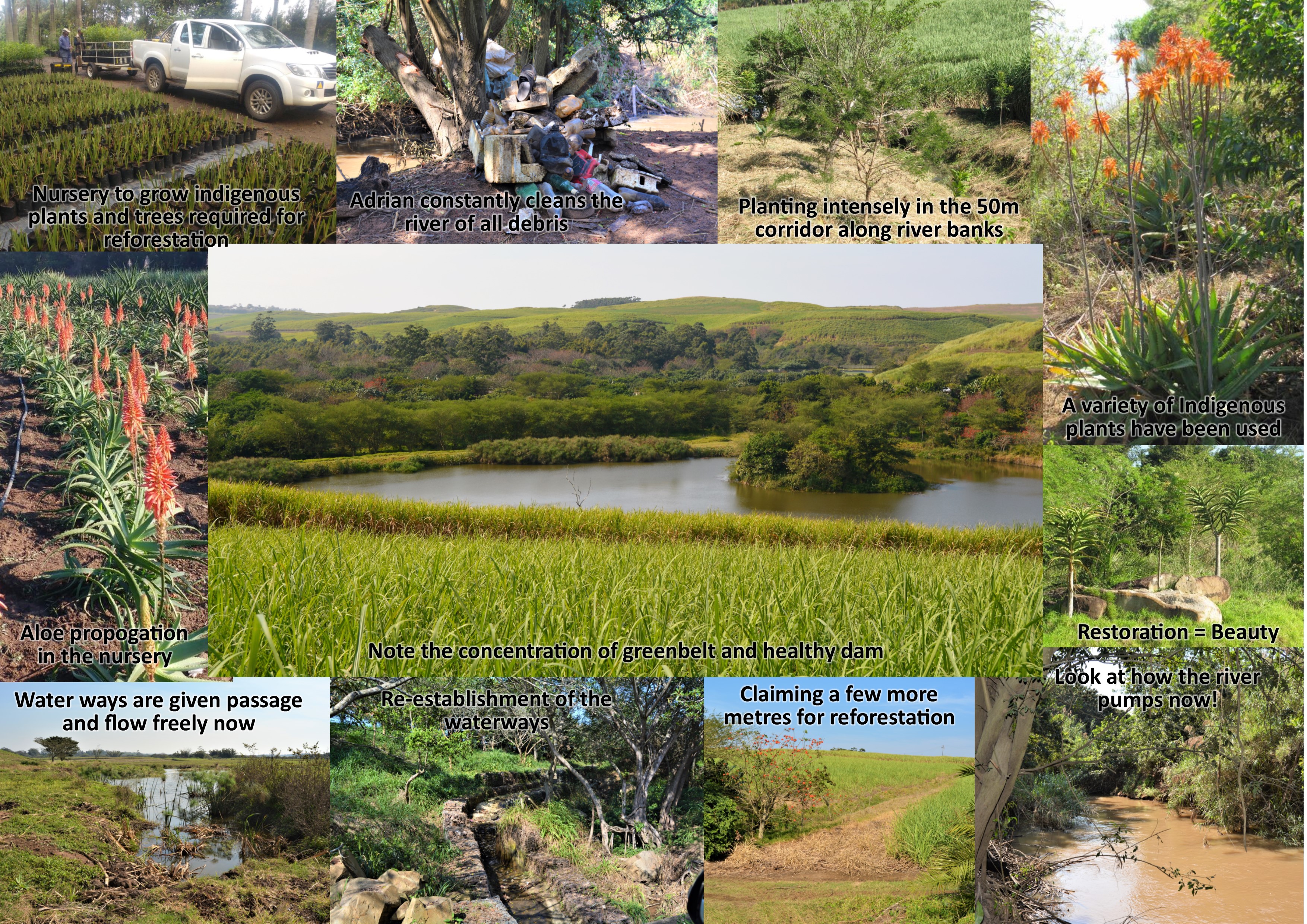 This map shows the extent of the reforestation undertaken by Adrian. Phenomenal. He is successfully restoring about 2 km of the Umhlali, mostly on both banks, and about 1 ½ km on the Tete river, mostly on one bank. Planting trees is one thing, keeping the aliens out is another thing altogether. Hence, he does not claim to have fulfilled his obligation to the environment and keeps the project going by clearing and planting seasonally.