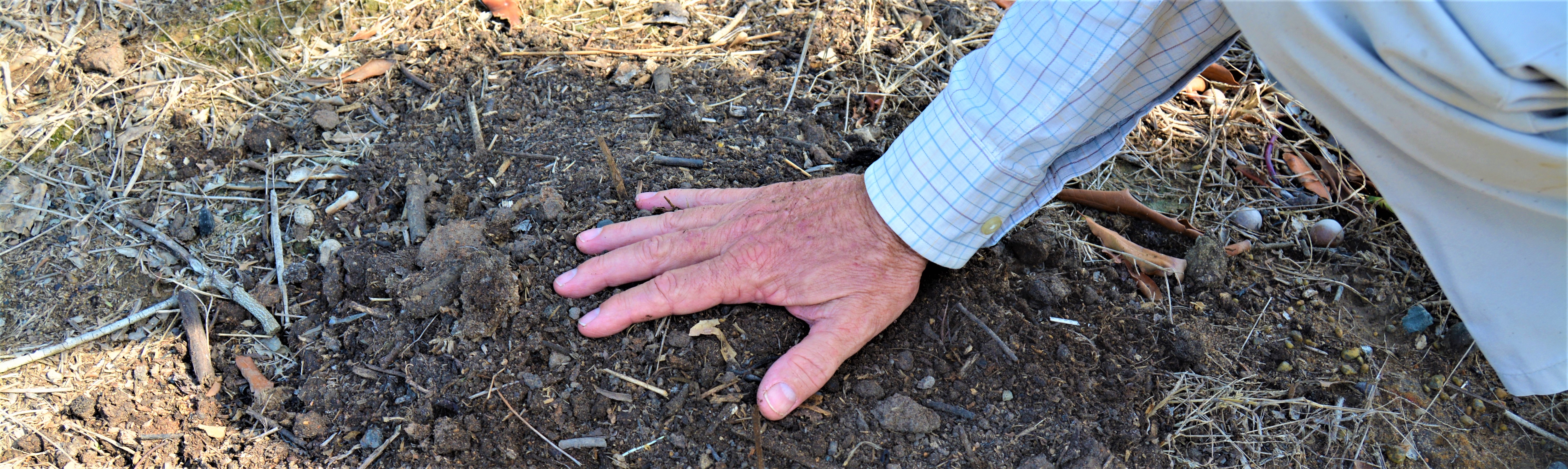 Once the hay has composted well, it is used to add micro-organisms to the soil around the base of each tree. Here Adrian shows how healthy the soil is looking since they started this Organic Fertiliser operation.
