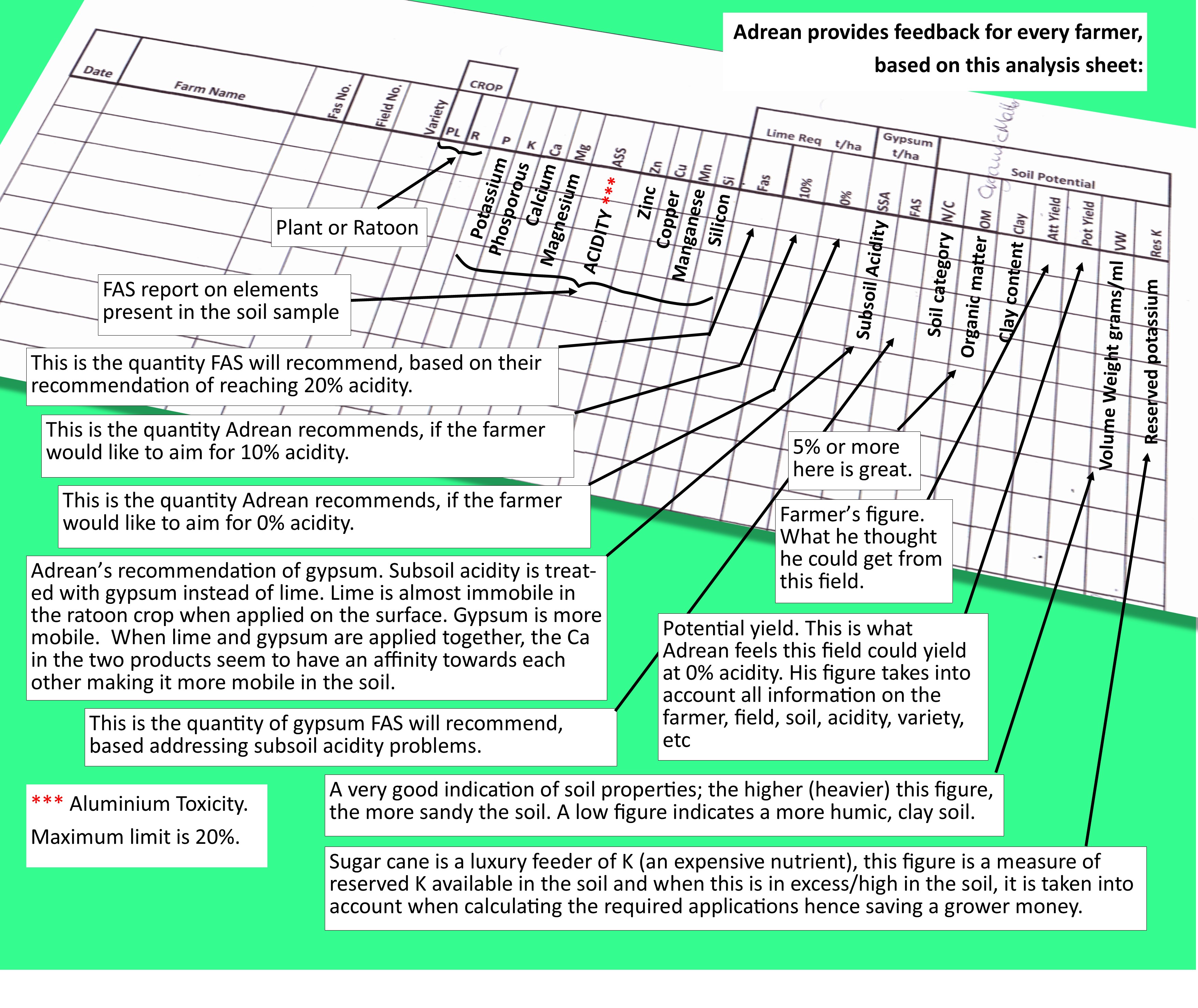 In this report, Adrean shows the FAS results and then makes an assessment on the soil potential so that he can spot disparities. Then, he has a discussion with the farmer as to why there is a difference between what the farmer thinks he can get from the crop and what Adrean thinks is possible. Based on these discussions, adjustments are made to the recommended lime & gypsum doses. N, P & K requirements are given in the FAS report and Adrean does not differ with these recommendations.
