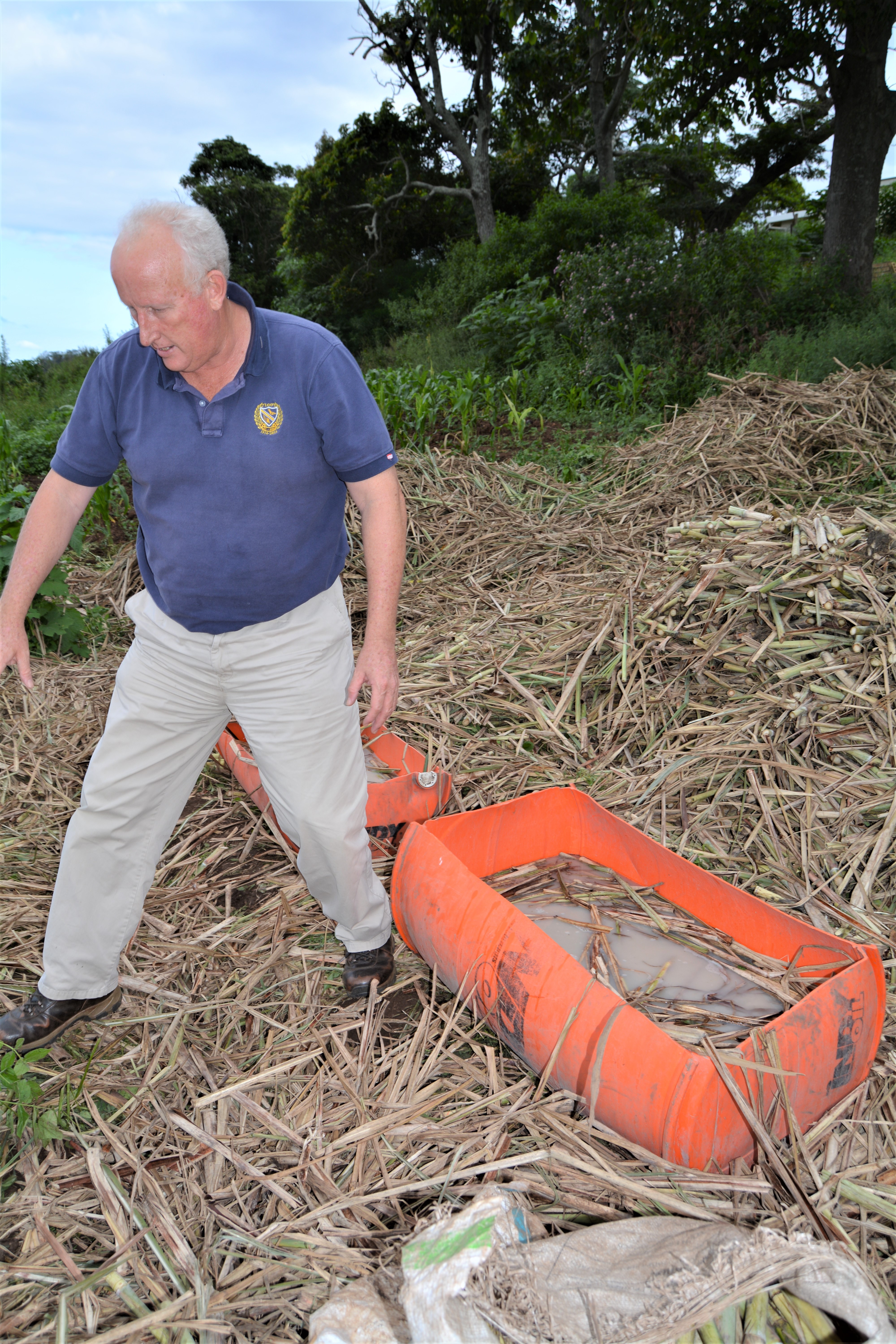 Vince, showing the drums of fungicide that he dips the seedcane into pre-planting