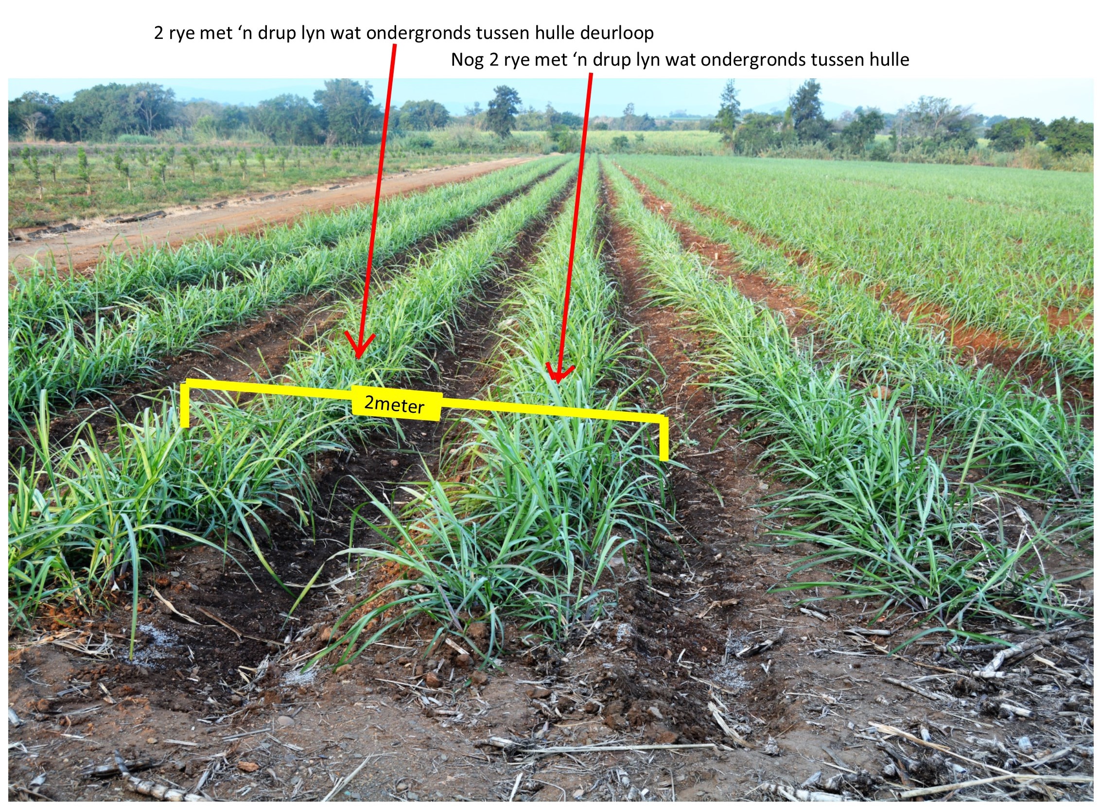 3. Drup-besproeiing. Hulle is tans besig om 30 hektaar se ondergrondse drup-besproeiing se installasie te voltooi. Alhoewel hierdie ‘n baie duur projek is, glo hy dat dit ‘n wyse besluit is aangesien daar laer verdampingskoste is, sowel as tydsvoordele wat drup-besproeiing het teenoor die sproeiers wat die plaas nog altyd gebruik het. Sproeiers neem 7 dae om deur die suikerriet plantasie te beweeg. Drup besproeiing besproei dieselfde oppervlak binne een tot twee ure. Daar is op die oomblik omtrent 5 boere in Pongola wat besig is om oor te skakel na drup-besproeiing. Die Du Plessis het die maatskappy, Inyoni Irrigation, ingekontrakteer om die projek vir hulle te behartig. Die landerye word oorgeplant met die nuwe drup-besproeiing en Thinus gebruik nuwe spasiëring wat spesifiek werk vir drup-besproeiing. Die huidige spasiëring is 2 lyne van 1.45m, nou is dit 4 lyne van 2m. Dit beteken dat hy 3400m meer suikerriet in dieselfde oppervlak kan plant en meer opbrengs uit hierdie oppervlak kan kry. Nog ‘n voordeel van die drup-besproeiing is dat die suikerriet langer gaan hou, alhoewel hy met elke uitploeg van die landery dit sal moet herpyp, hy dit minder gereeld sal hoef te doen. Hy verminder ook die landery-verkeer en sodoende die kompaktering deur gebruik te maak van Matriarchs laaiers in teen stelling met konvensionele laaiers. Die enigste nadeel van die drup-besproeiing is die koste daaraan verbonde maar hulle is vol vertroue dat hierdie belegging alreeds ‘n opbrengs sal toon binne die eerste 2 jaar.