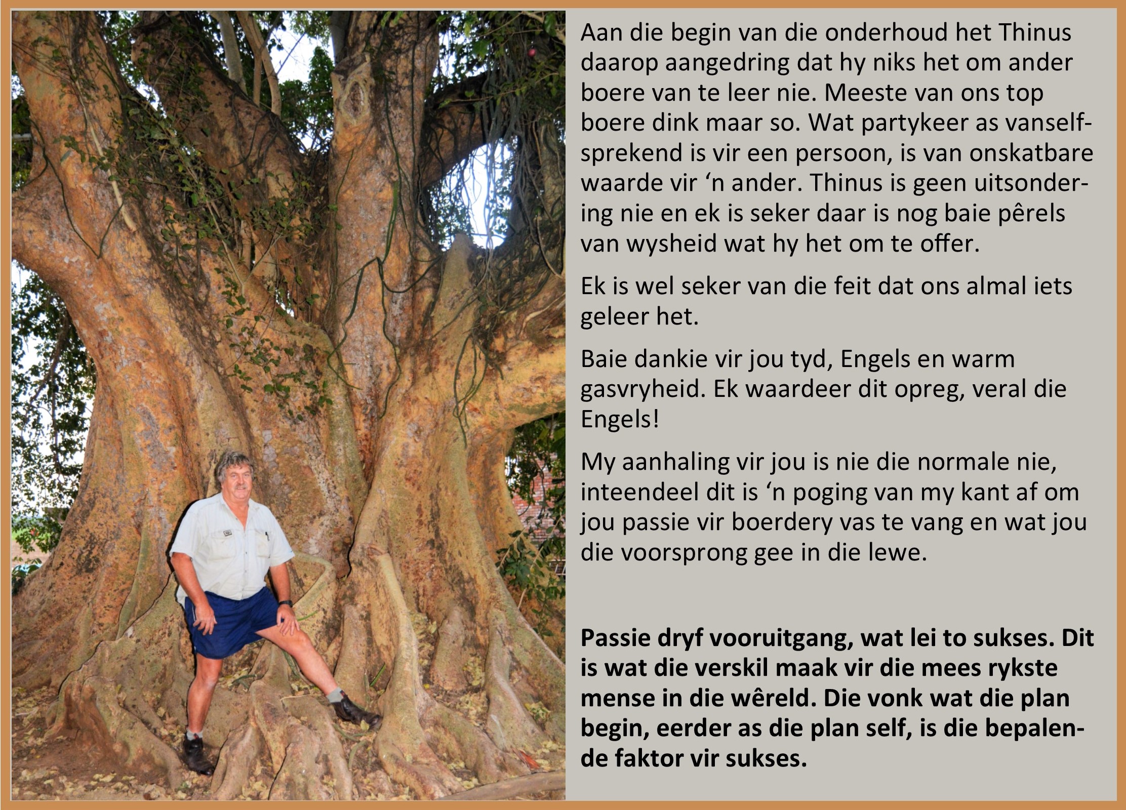 Hoe gereeld hoor ons nie dat die duiwel in die besonderhede is nie, of dat uitnemendheid net ’n samevatting is baie klein dingetjies, wat alles goed gedoen is? Ek glo opreg in hierdie beginsel en het die Du Plessis sukses eerste hands beleef in klein dingetjies soos respek vir die pad se rand, of ordentelike dreinerings kanale of sommer net die etiese draad wat deur die besluitnemingsproses op hierdie plaas hardloop … dinge wat nie jou wins gaan beïnvloed nie, maar die dinge wat ‘n goeie boer van ‘n briljante boer skei. I haal my hoed af vir hierdie familie wat regtig briljante boere is!