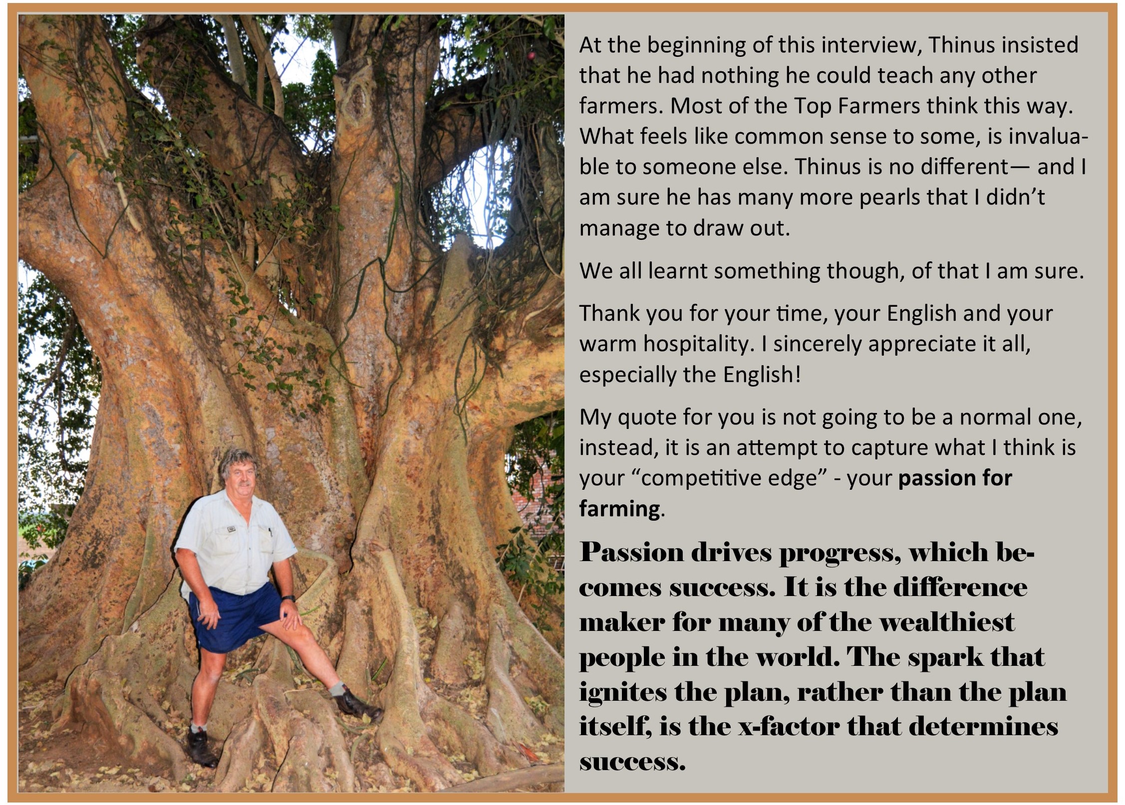 • Believe in what you do. Thinus believes in this country, his product, and he loves his farm passionately. Academic farming is useful to a point, but to take it to the next level, takes belief and passion.