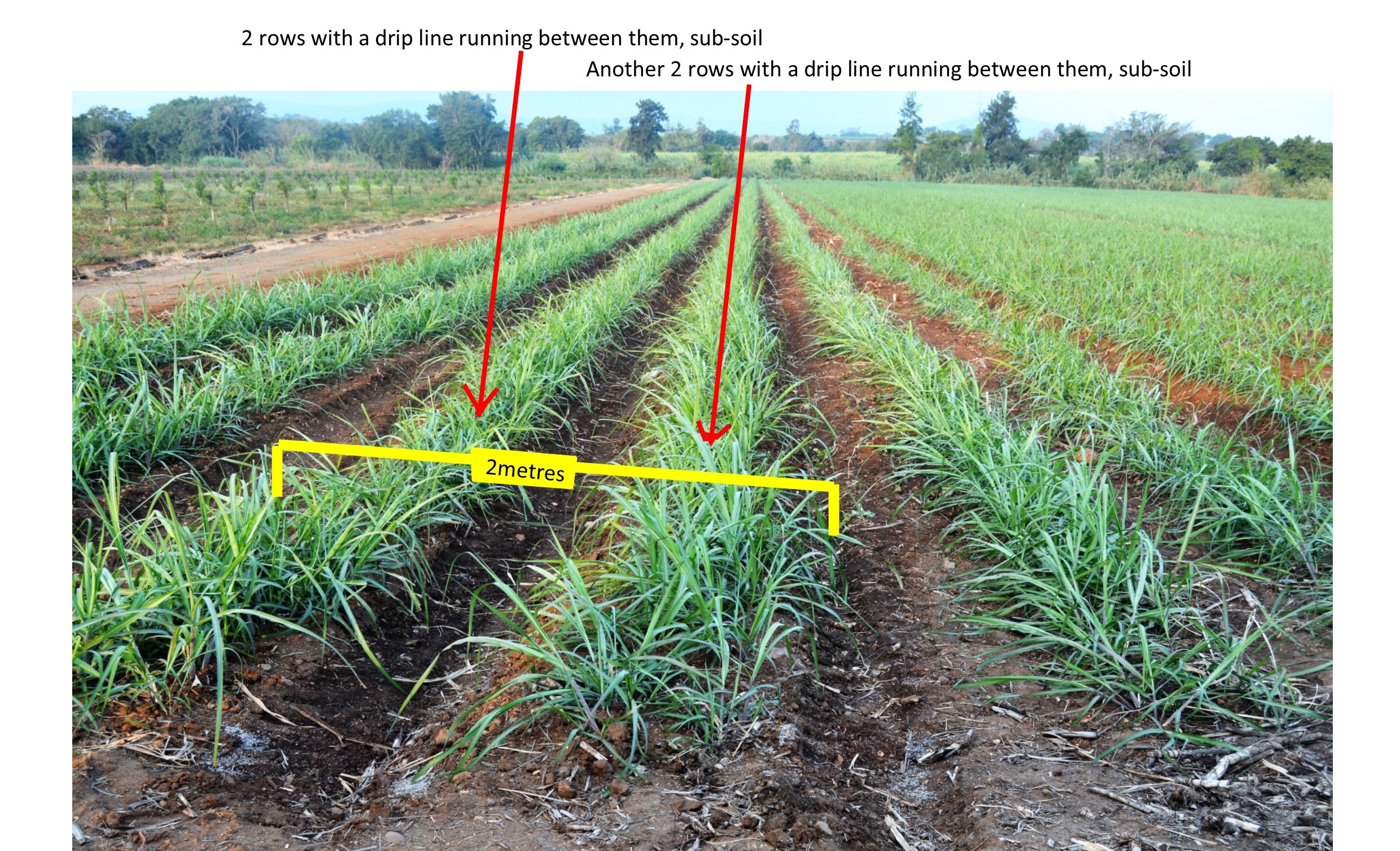 3. Drip irrigation. They are finishing up with an installation of 30hect of sub-soil drip irrigation. Although this is a very expensive project he believes it is wise because of the lower evaporation cost and the timing benefits of drip irrigation over sprinklers which is what his farm has always had. Sprinklers take more or less 7 days to get through a cane field, where as drip will cover the same area in a much lessor time. Right now, in Pongola, there are about 5 farmers changing fields over to drip. Inyoni Irrigation is the company the Du Plessis contracted to handle this project for them. Obviously, these new drip fields are being replanted and Thinus is using a new spacing that works for the irrigation. He will also be limiting in-field traffic (and therefore compaction) and using Matriarchs as opposed to conventional loaders. Previously the spacing has been 2 lines in 1,45m. Now, there will be 4 lines in a 2m spacing. This means he will get 3400m more cane into (and out of) these fields. Another advantage of drip irrigation is that the cane will last longer, so – although ploughing out will mean repiping a field, he will have to do it less often. The only disadvantage of drip is the cost but they are confident that this investment will already show a return within the first two years.